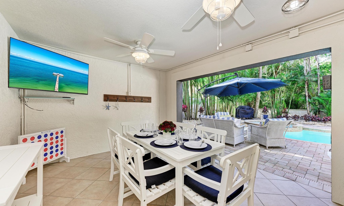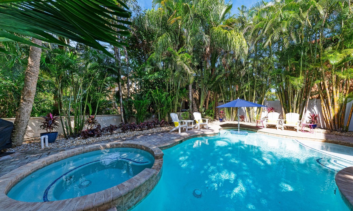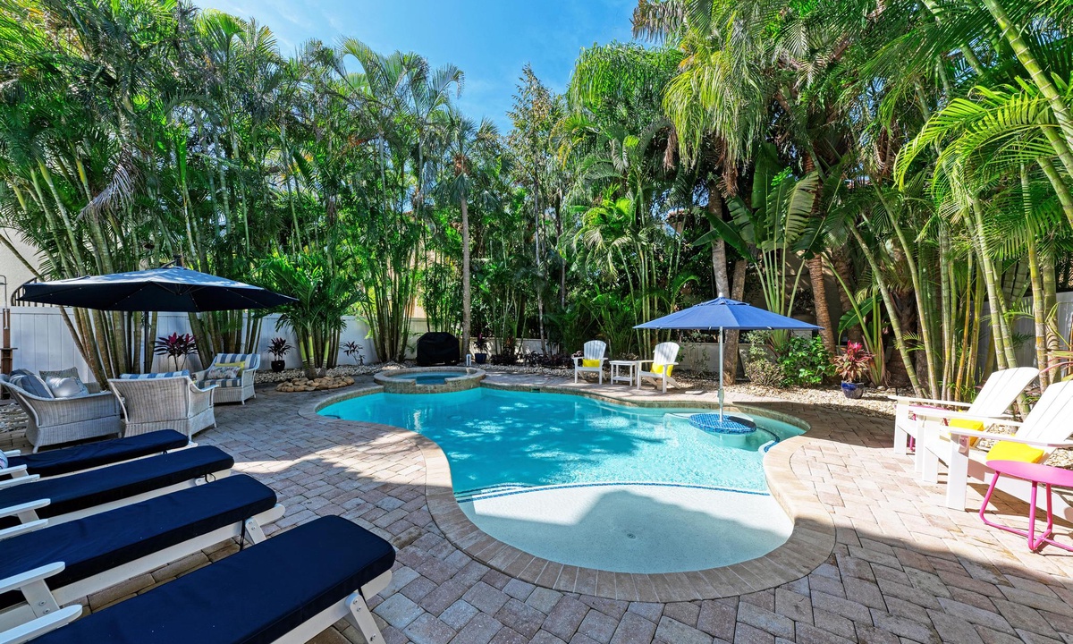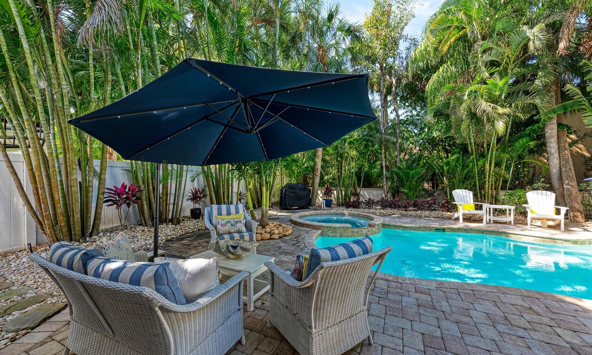 If your goal is secluded relaxation, the private heated pool and hot tub are sure to please. Soak in the sun in a lounger, sip a refreshing drink at the in-pool table, melt your stress away in the hot tub, or curl up with your favorite book on the balcony overlooking the pool. You can even kick back and watch TV in the covered patio area, complete with fans to keep a gentle breeze going.