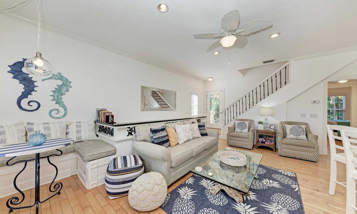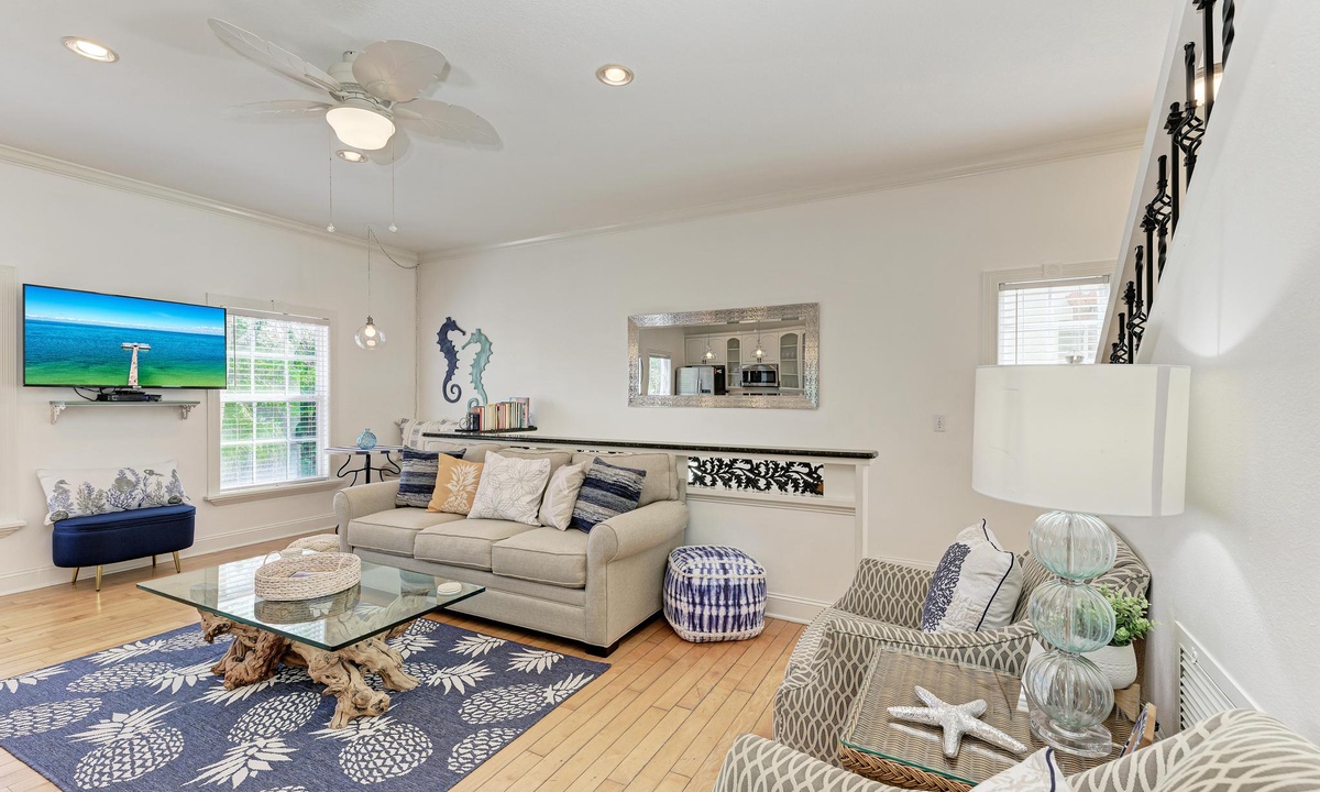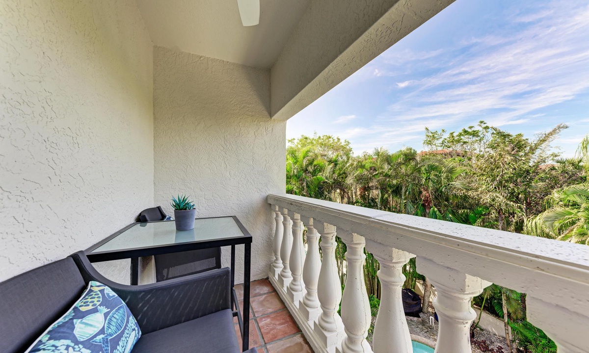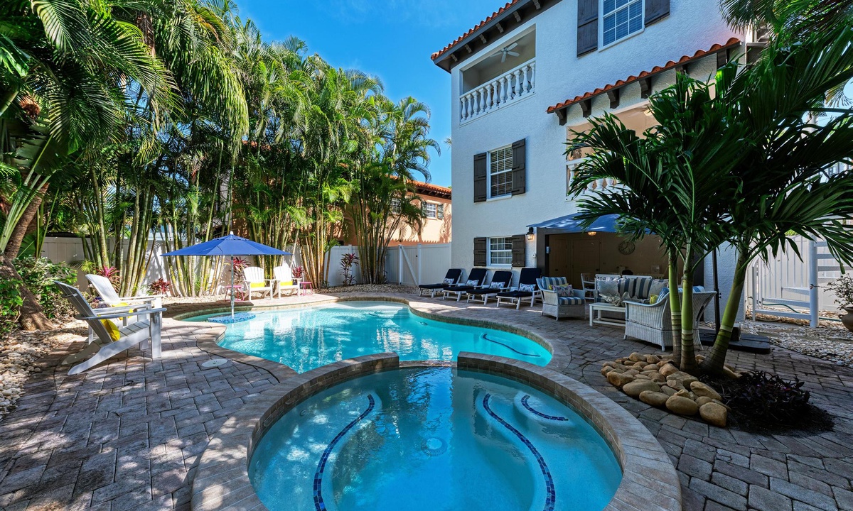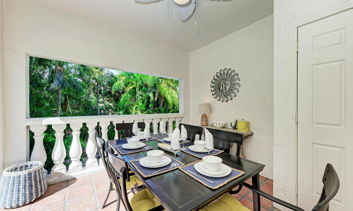 If your goal is secluded relaxation, the private heated pool and hot tub are sure to please. Soak in the sun in a lounger, sip a refreshing drink at the in-pool table, melt your stress away in the hot tub, or curl up with your favorite book on the balcony overlooking the pool. You can even kick back and watch TV in the covered patio area, complete with fans to keep a gentle breeze going.