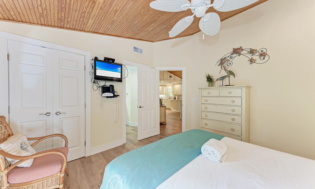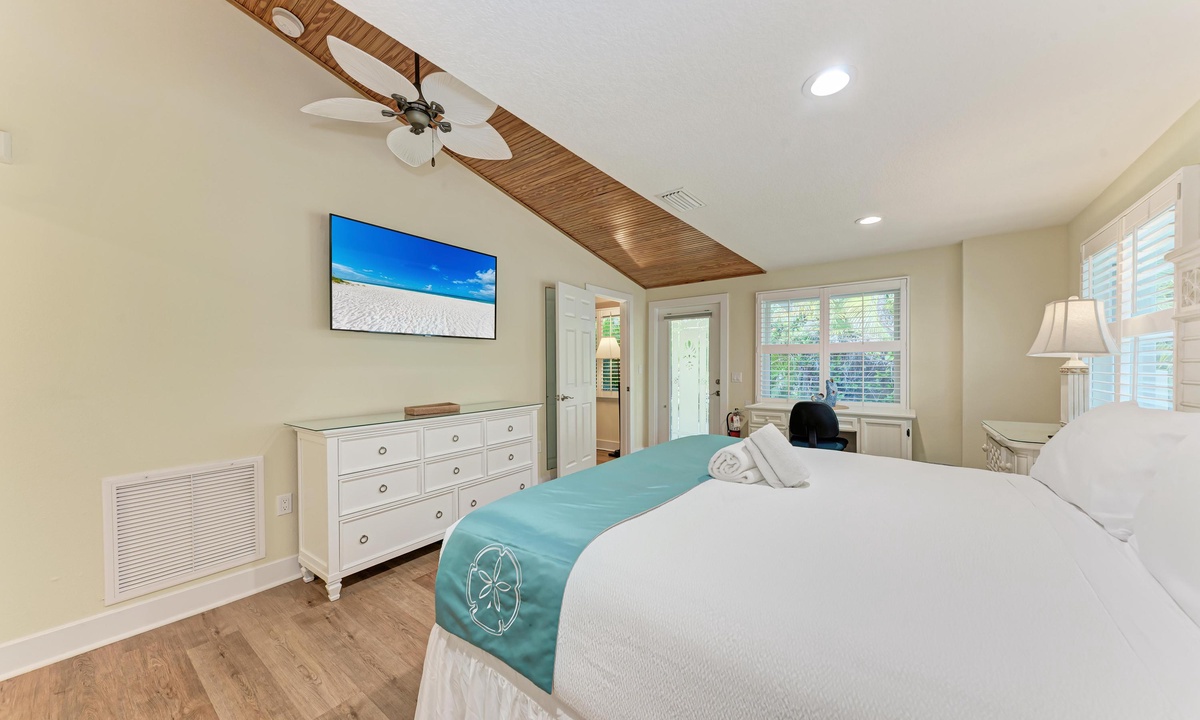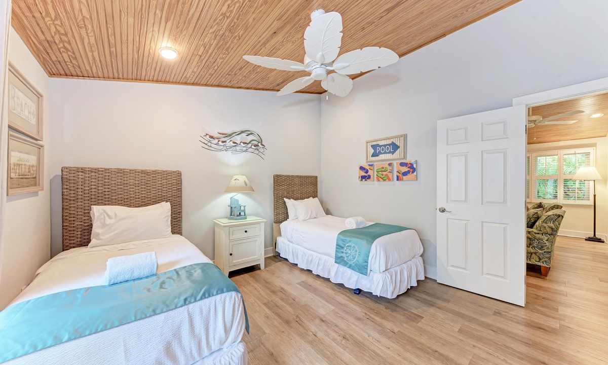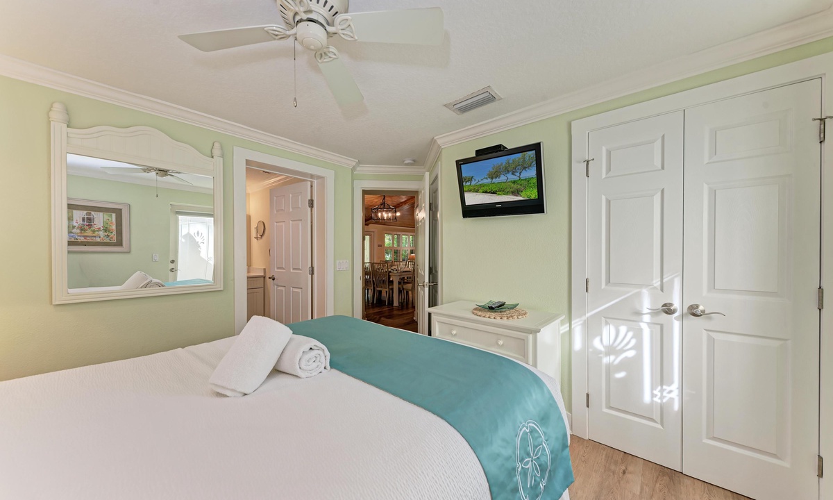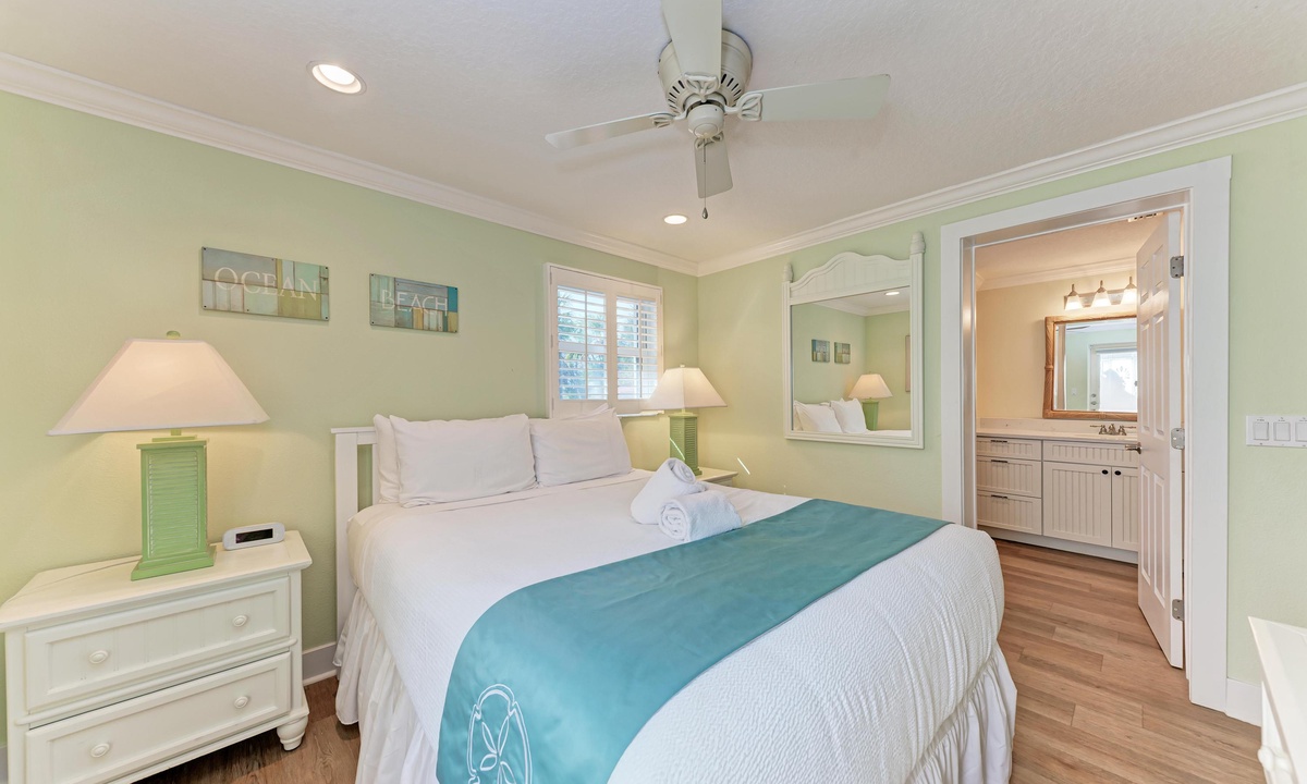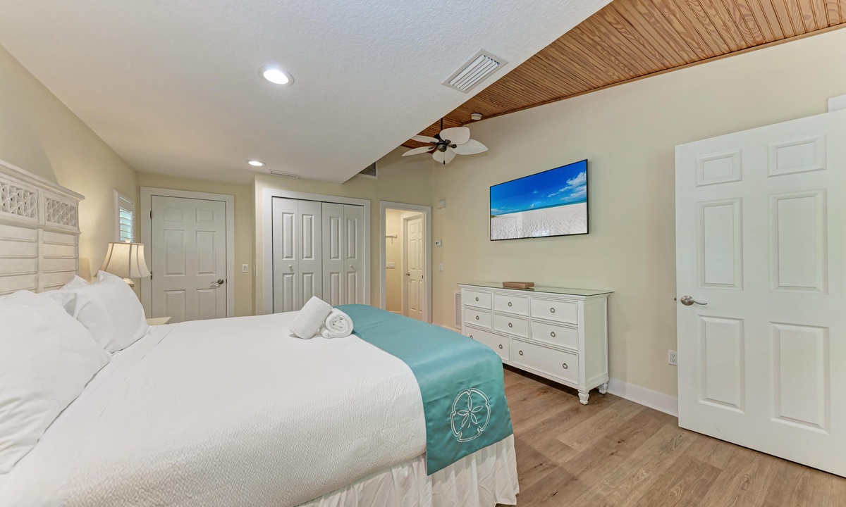 All four of the bedrooms at this Anna Maria Island vacation rental offer premium linens with 1 king bed, two queen beds and two twin beds to comfortably accommodate 8 guests. In the master bedroom enjoy a flat screen television and en-suite bathroom. Find a full bathroom off the living room and a third full bath en-suite to one of the queen rooms.