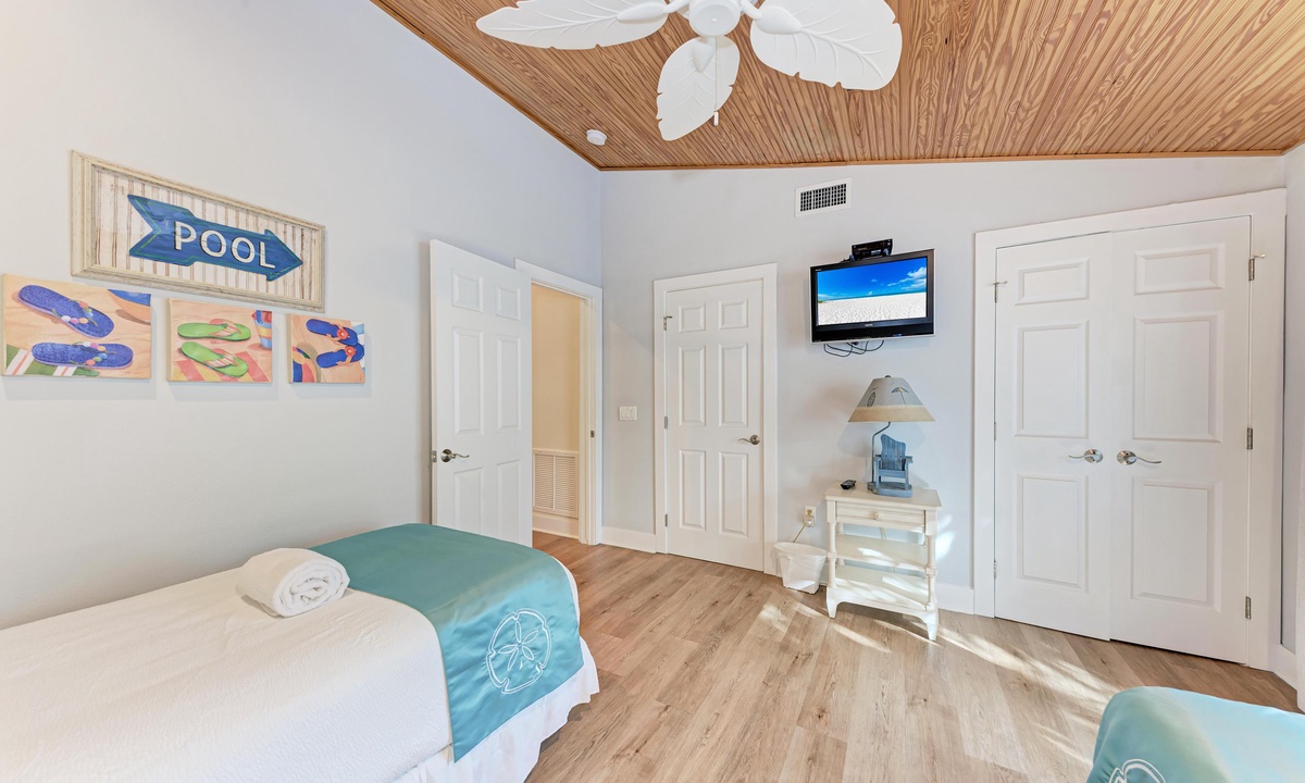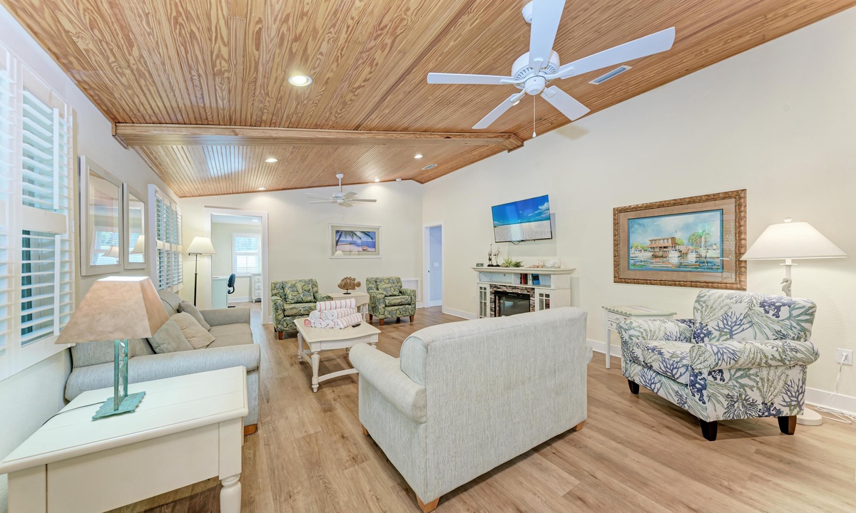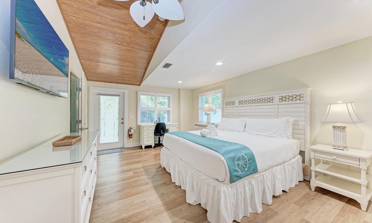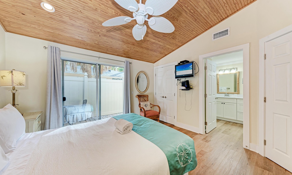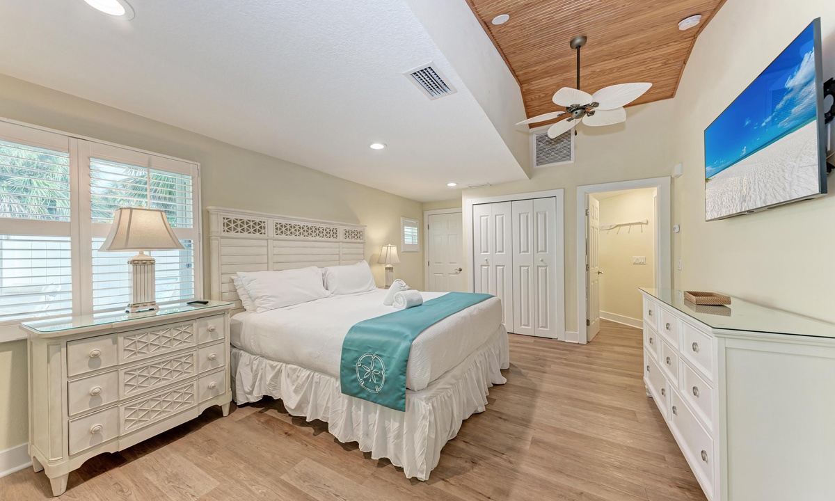 All four of the bedrooms at this Anna Maria Island vacation rental offer premium linens with 1 king bed, two queen beds and two twin beds to comfortably accommodate 8 guests. In the master bedroom enjoy a flat screen television and en-suite bathroom. Find a full bathroom off the living room and a third full bath en-suite to one of the queen rooms.