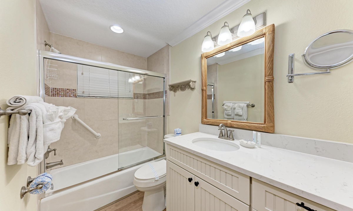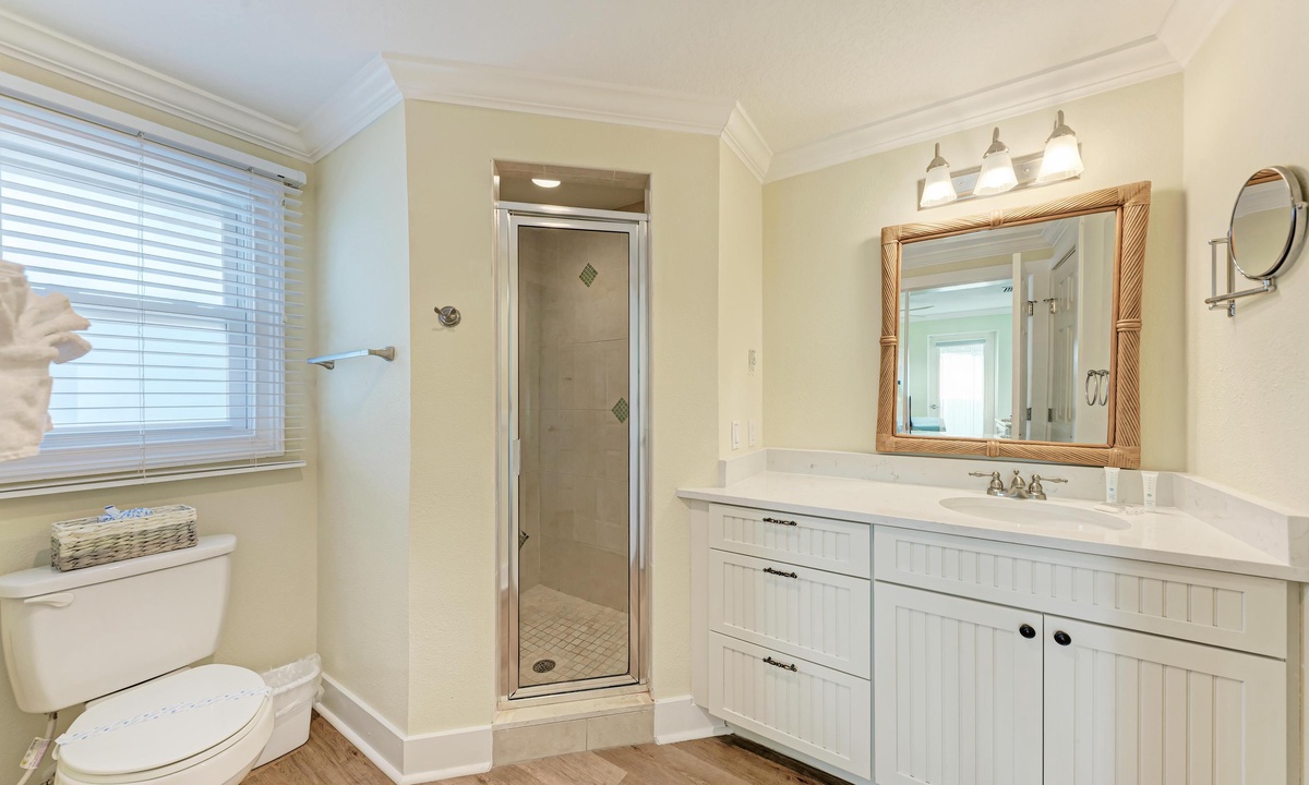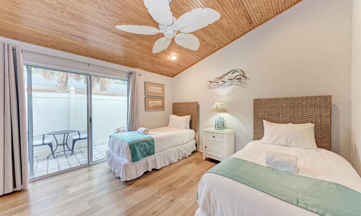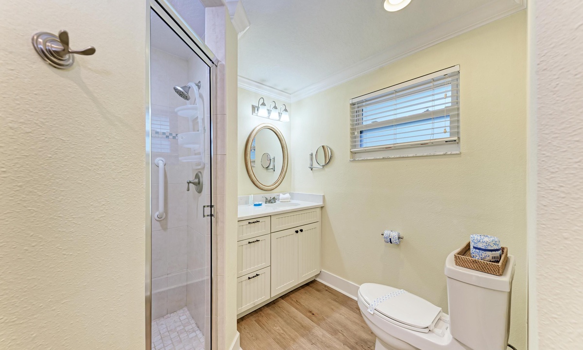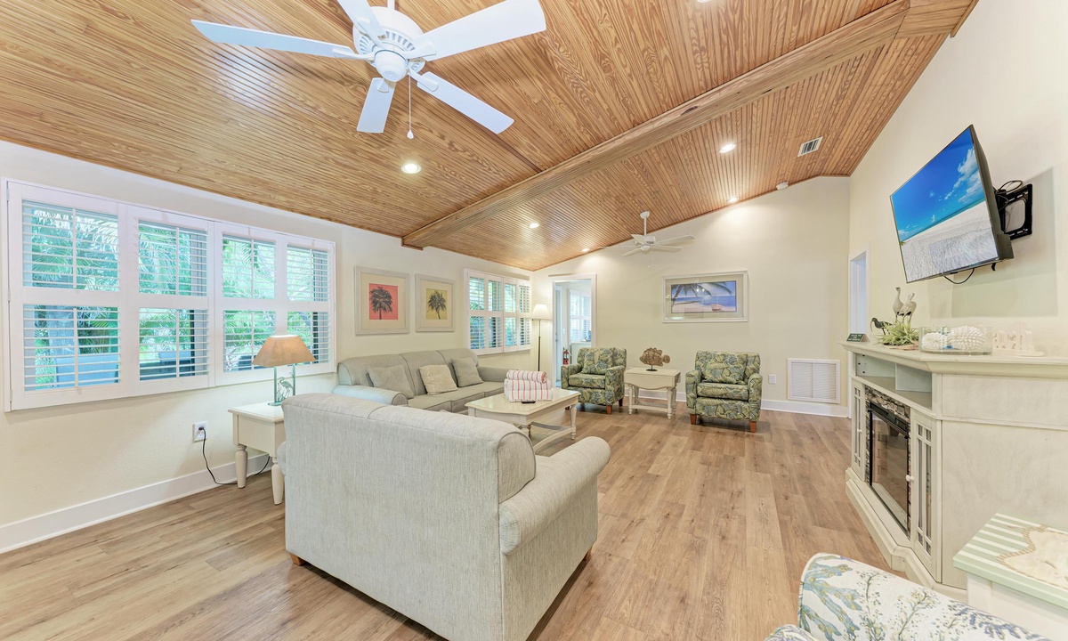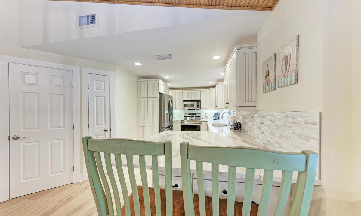All four of the bedrooms at this Anna Maria Island vacation rental offer premium linens with 1 king bed, two queen beds and two twin beds to comfortably accommodate 8 guests. In the master bedroom enjoy a flat screen television and en-suite bathroom. Find a full bathroom off the living room and a third full bath en-suite to one of the queen rooms.