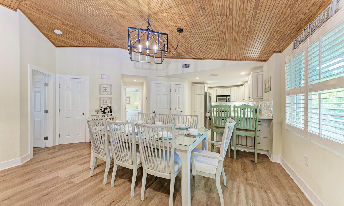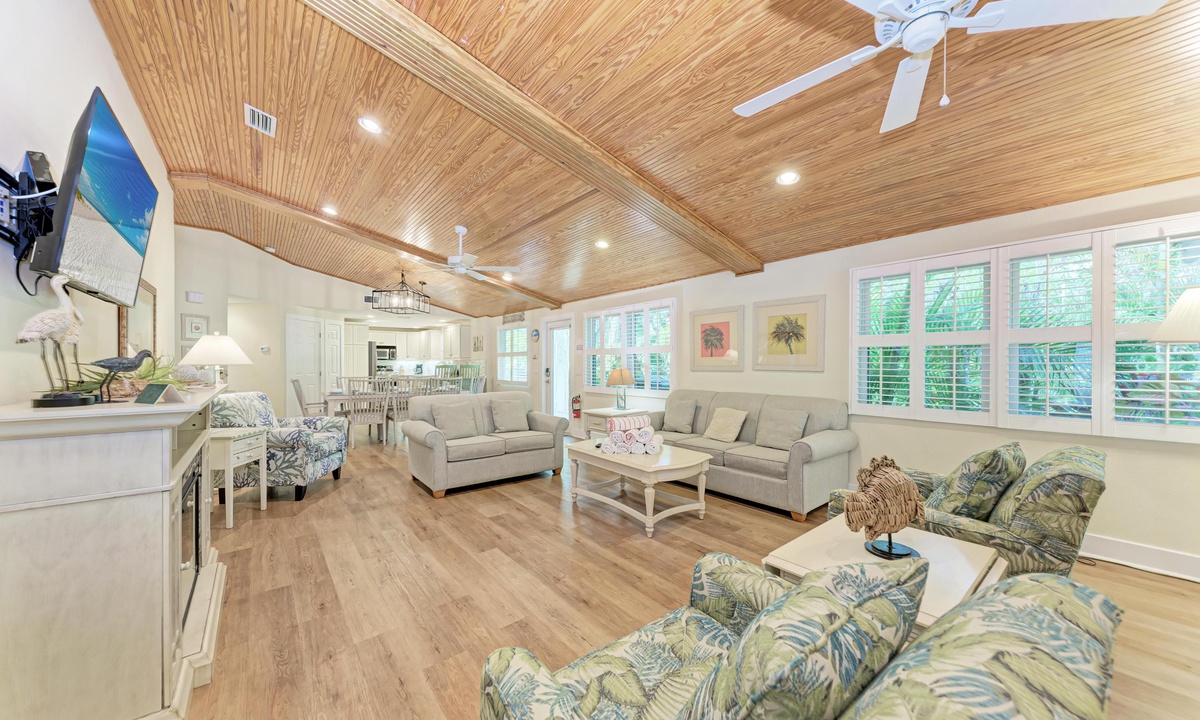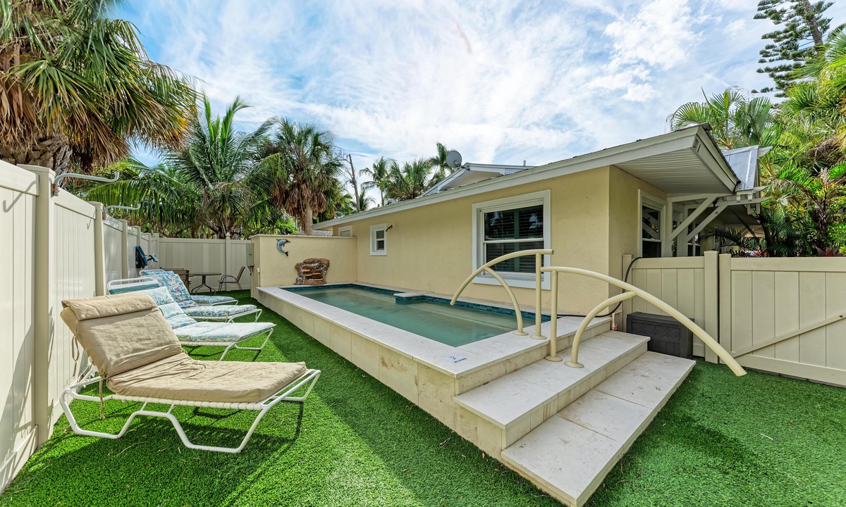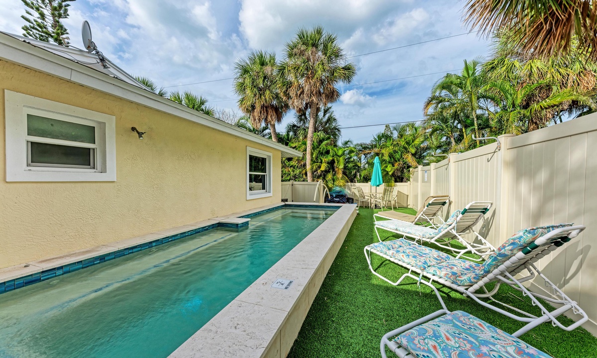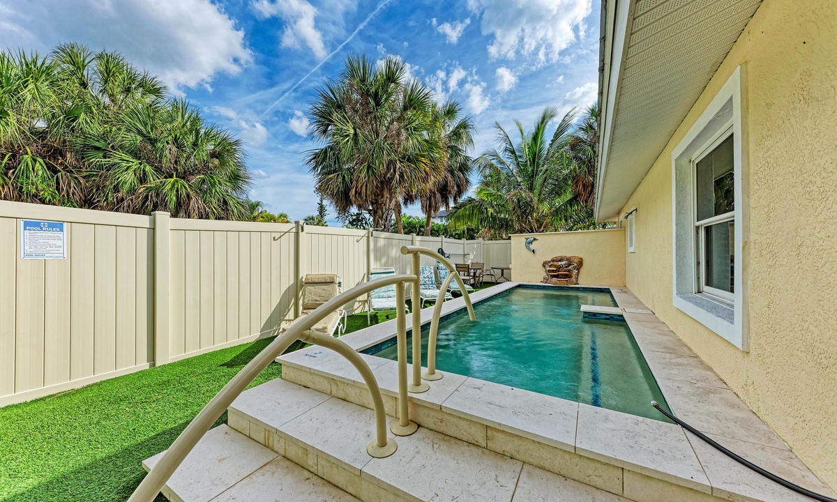 Step just outside this gorgeous home to your private patio with a pool, outdoor seating, outdoor shower and barbecue. The private pool is heated with lush tropical landscaping, seating for eight, and recliners for sunbathing. The home is truly family friendly for all ages.