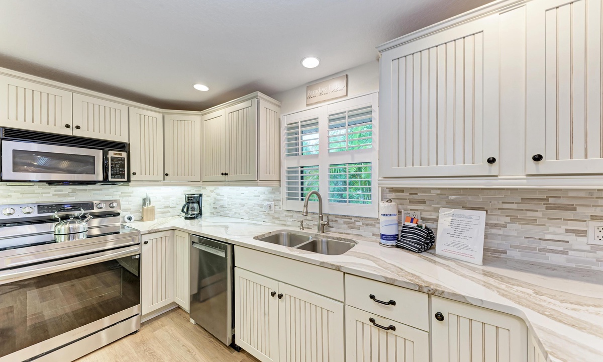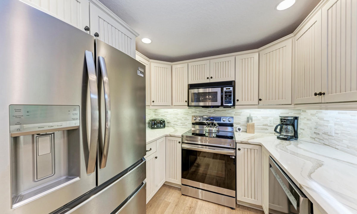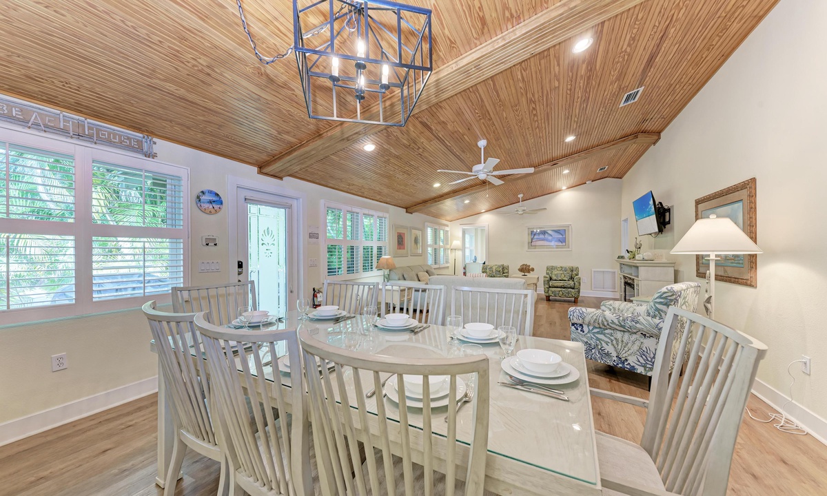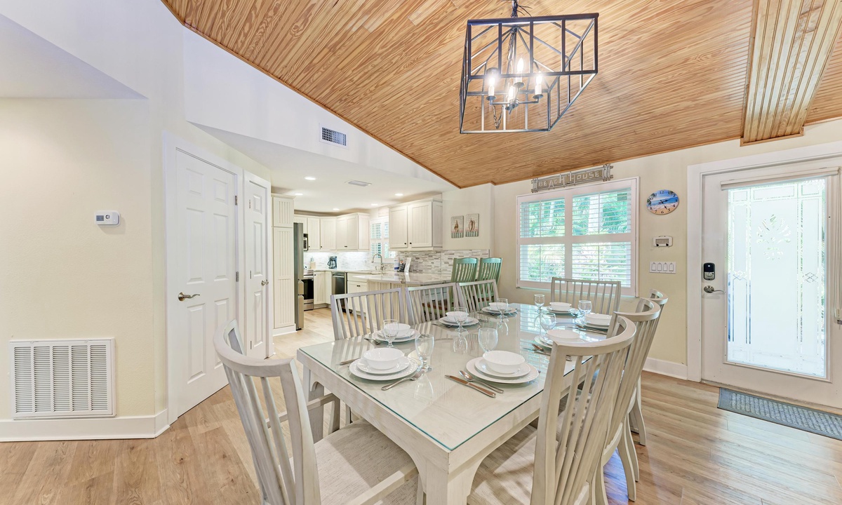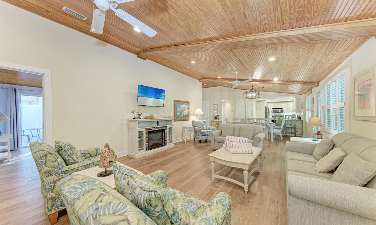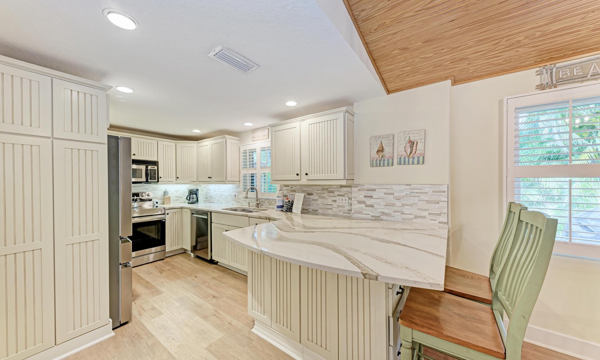 Inside “Harrington Cottage” find a comfortably furnished home to accommodate large groups. This beach home boasts an open kitchen, dining, and living area to encourage reconnecting with friends and family in the great room. In the kitchen find everything you need for creating meals including a dishwasher, and granite countertops for an added touch of luxury.