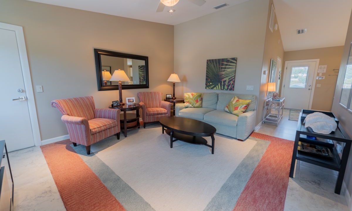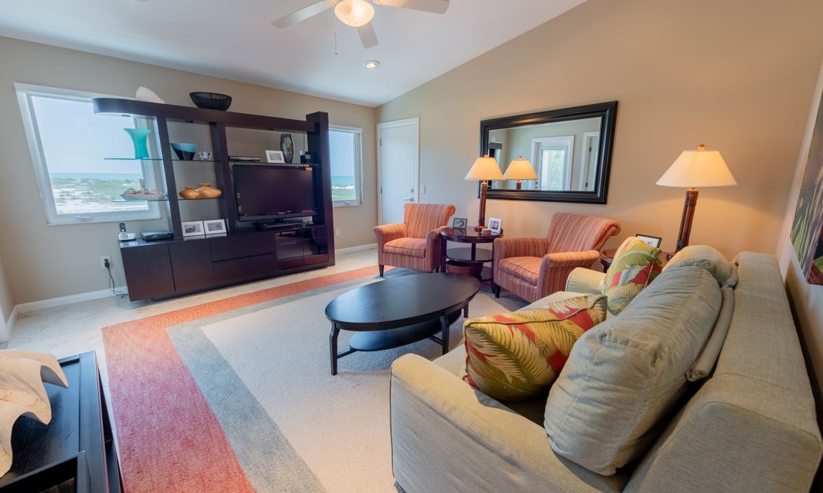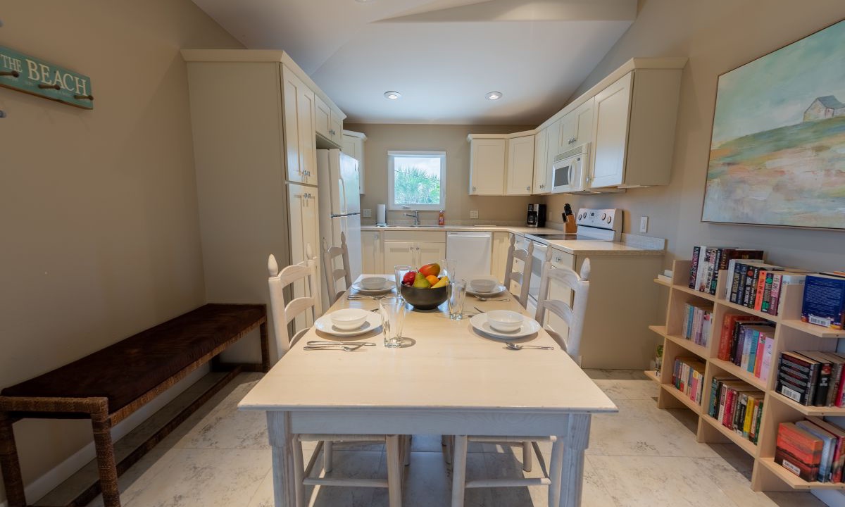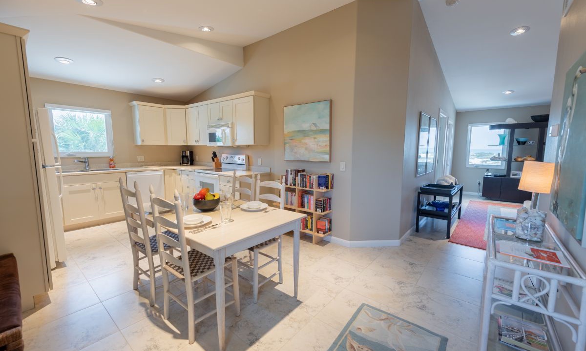 Upon arriving at Hidden Oasis, you’ll notice a stand-alone duplex with a blue exterior that beautifully matches the colors of the Gulf. There is a large driveway space, a two-car garage (for owner use only), and views from the covered balcony on the home’s second floor. The back patio is also owner-use only, but your elevated balcony has the best views in town. When you walk into the home’s common area on the second floor, you’ll immediately see the kitchen and dining room. The kitchen is spacious and offers tons of counter space, ample storage, and a full range of appliances. To the right of the kitchen is the dining area. It features a simple, yet charming dining table with seating for four. Further into the home is the living room. This large area offers guests a couch, two matching armchairs, and a flat-screen TV.