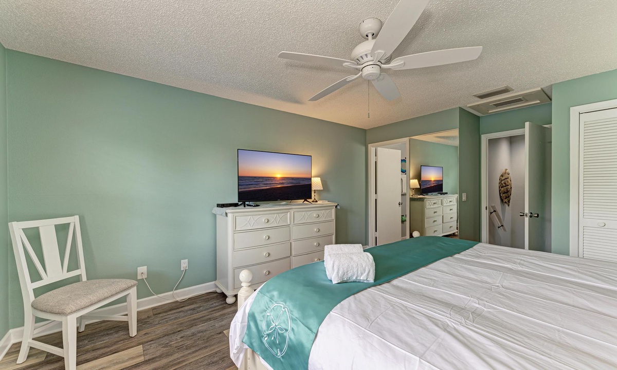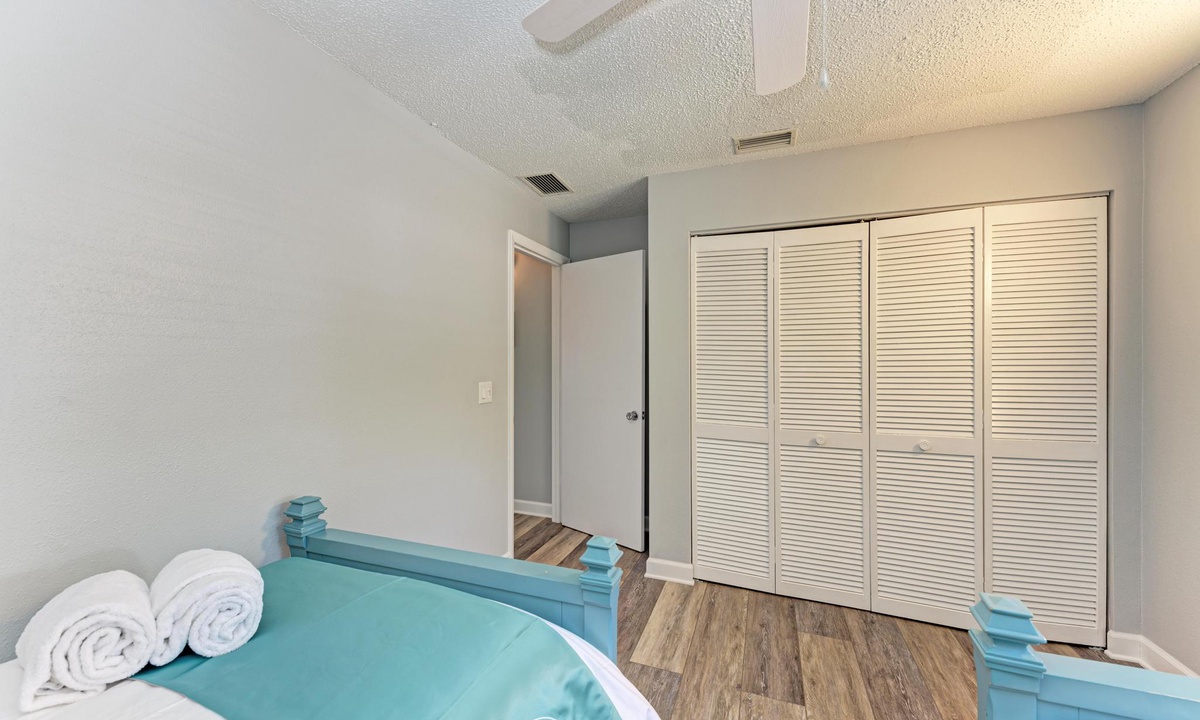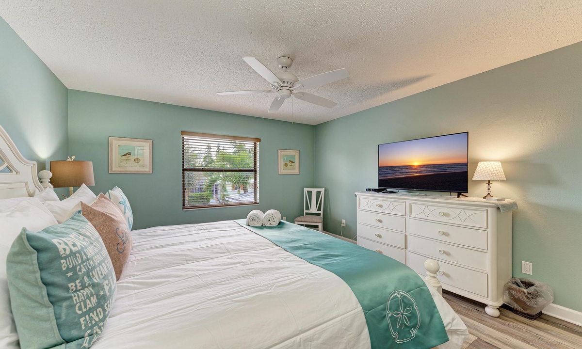 The master bedroom at “Hideaway” has a king bed, flat screen television, and closet. The Master bathroom offers a tub/shower combo. The guest room offers two twin beds and a flat screen television. The main bathroom offers a tub/shower combo. You’ll find a queen sleeper sofa in the living room so groups up to six can spread out comfortably.