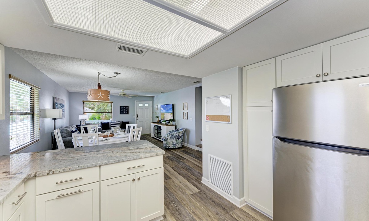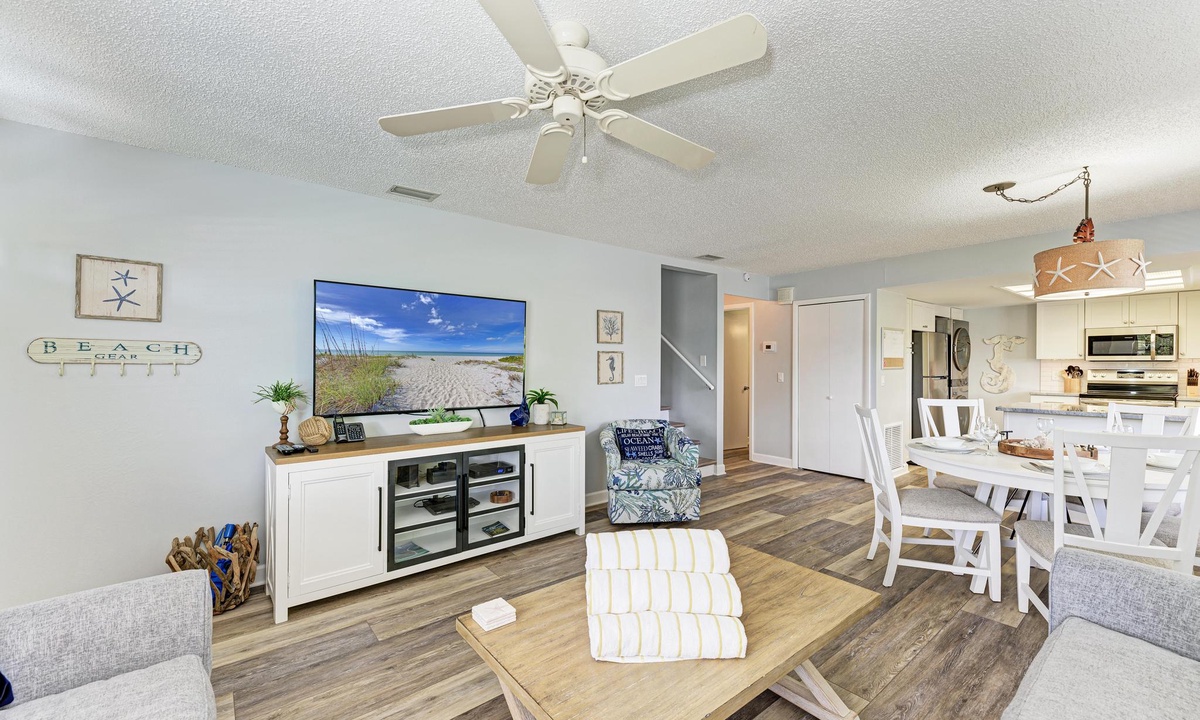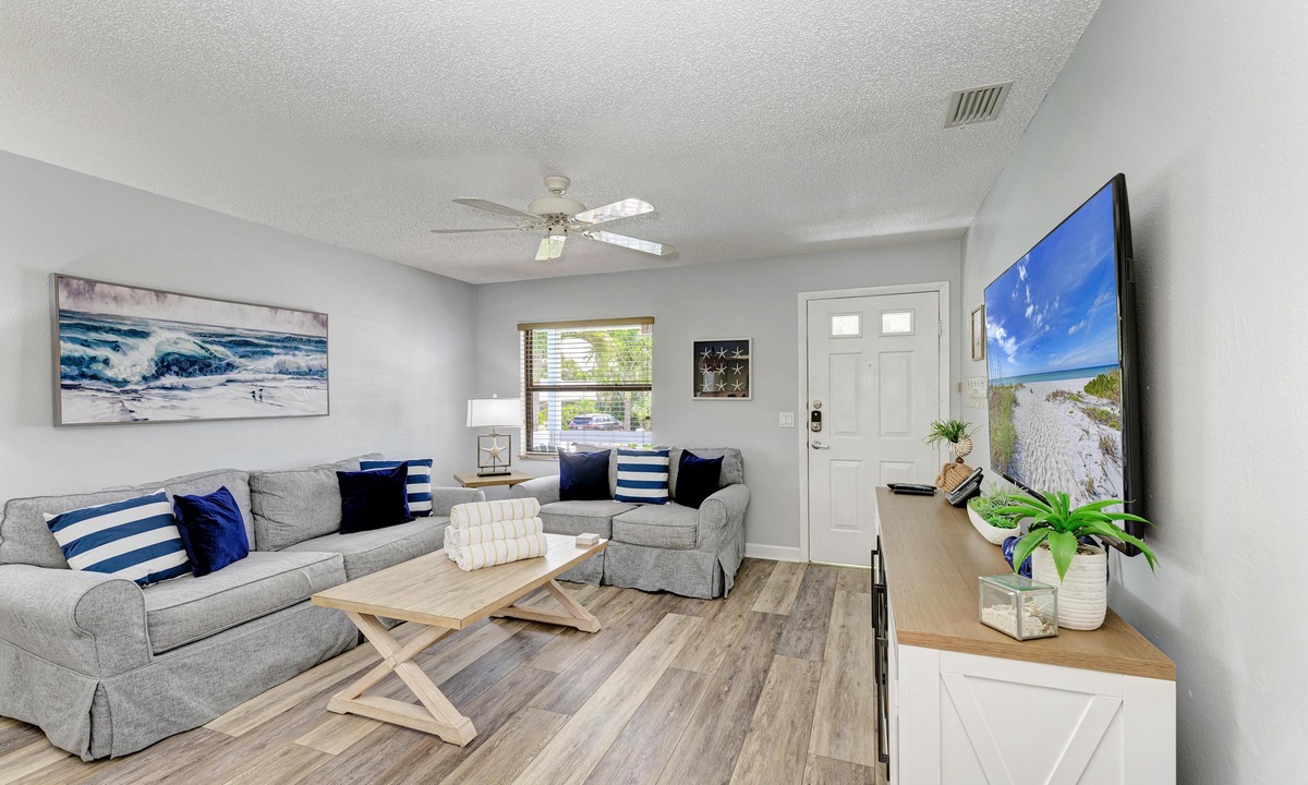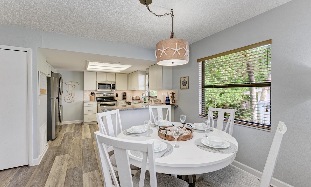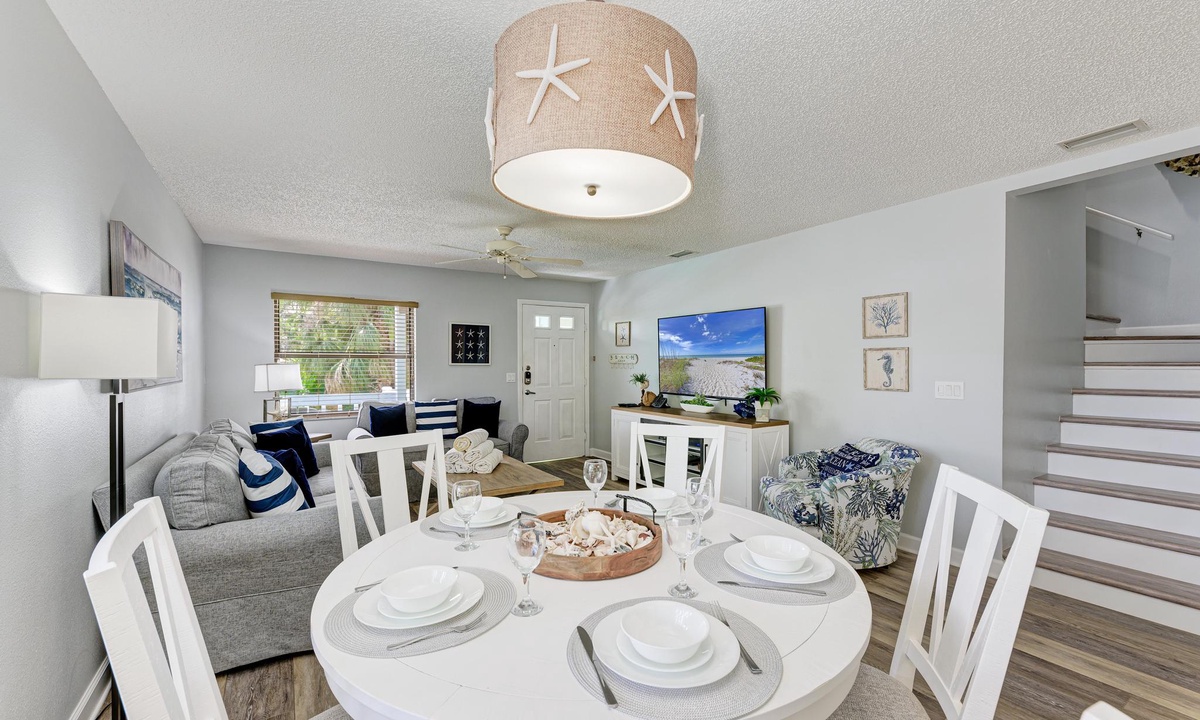 In the kitchen you’ll find all the basics for preparing meals including a dishwasher. The dining area can seat all six guests, or seat four at the kitchen breakfast counter. Off the living room and main entry you’ll find stairs leading into the front yard pool area.