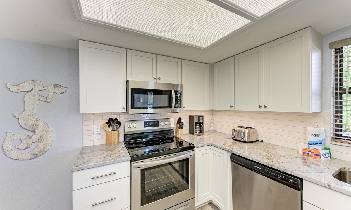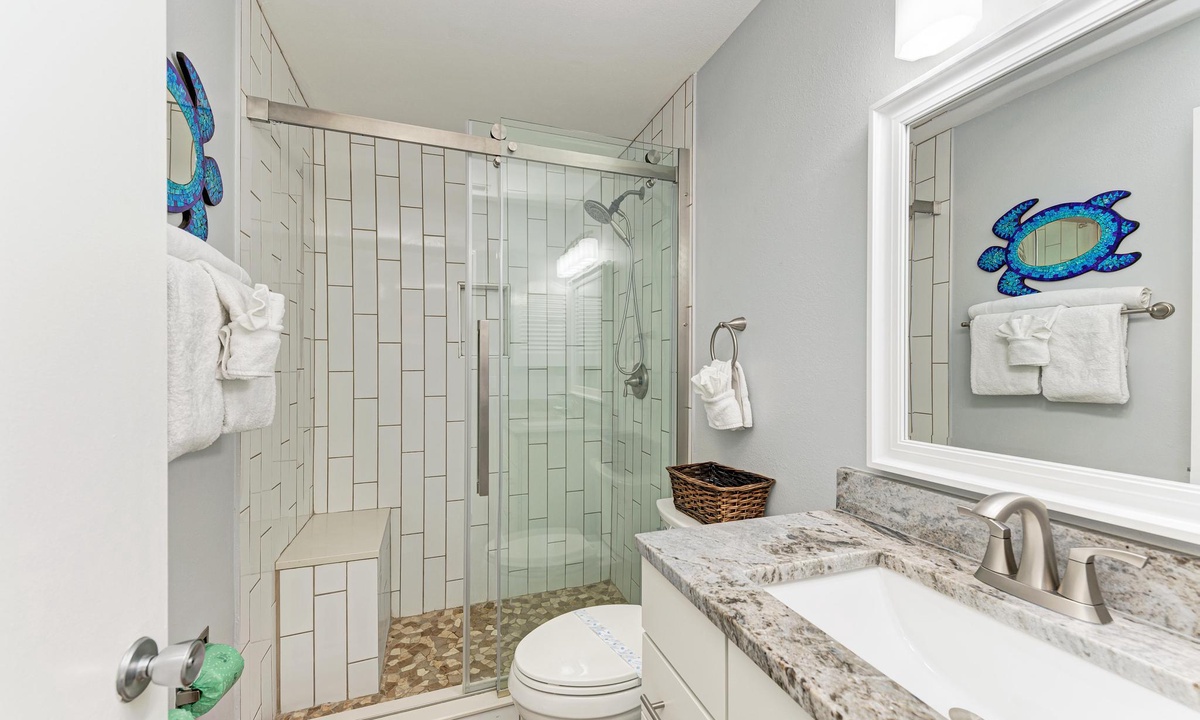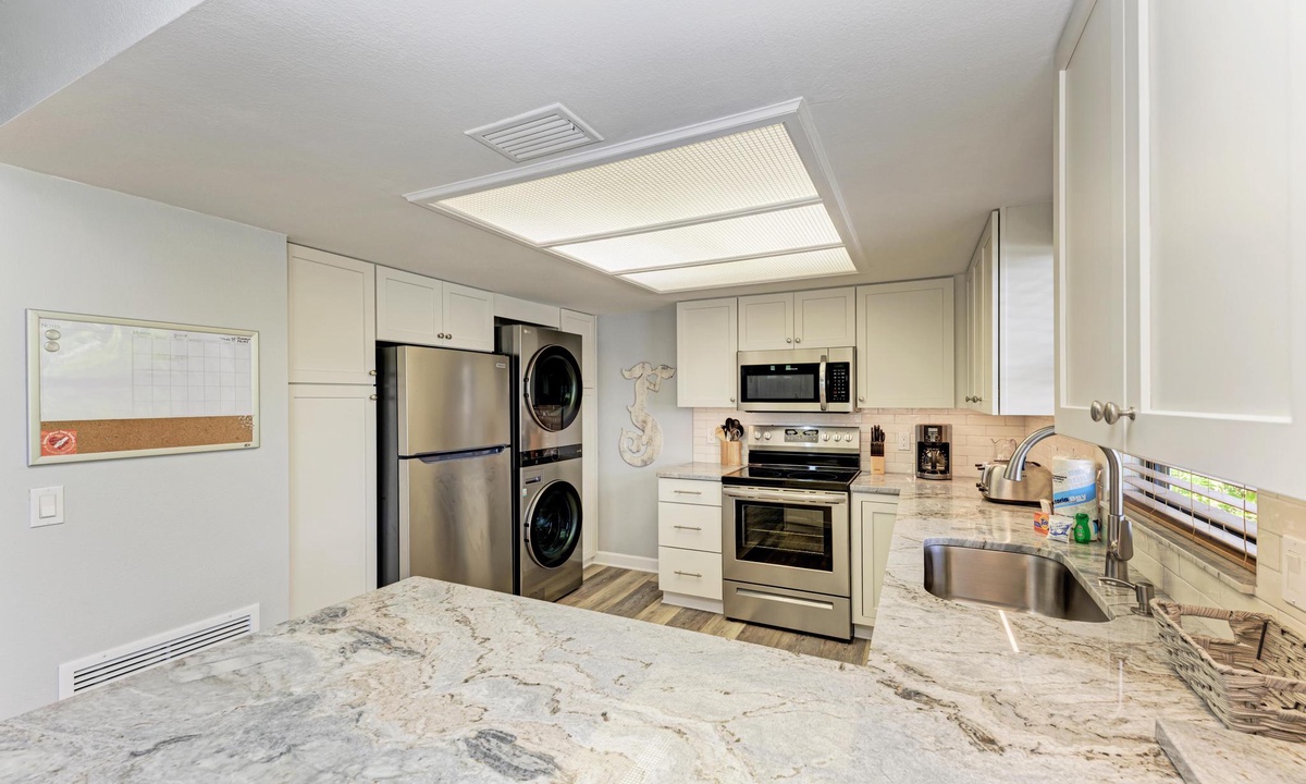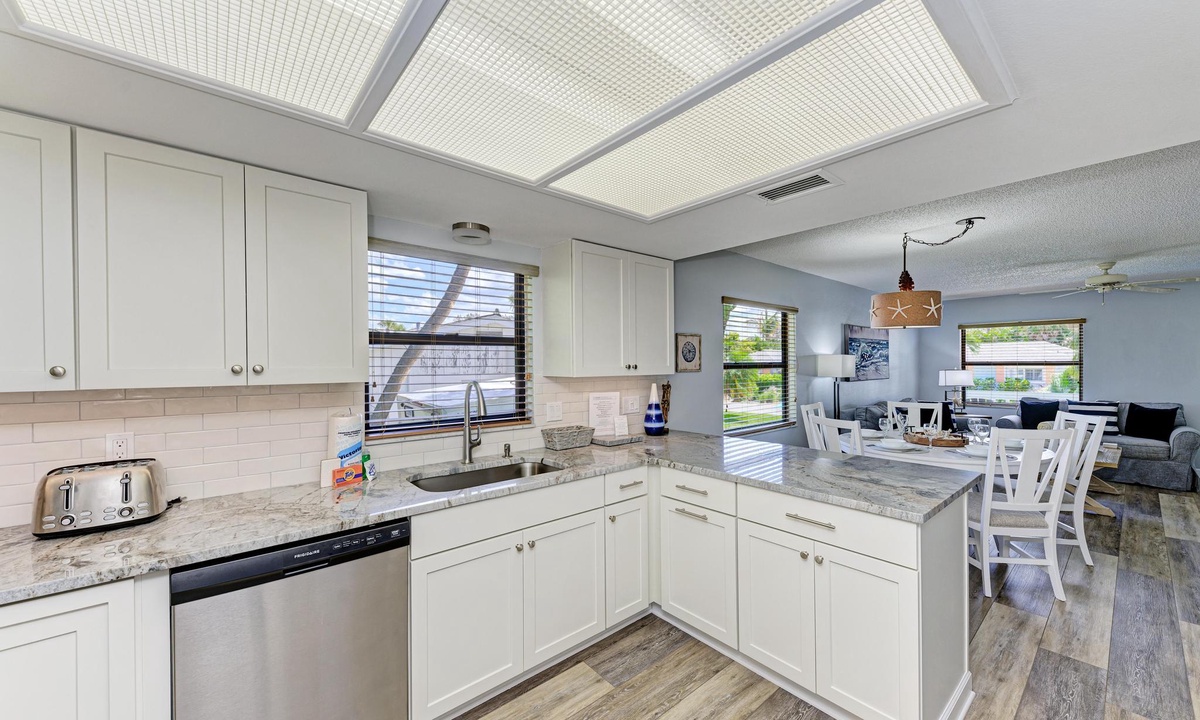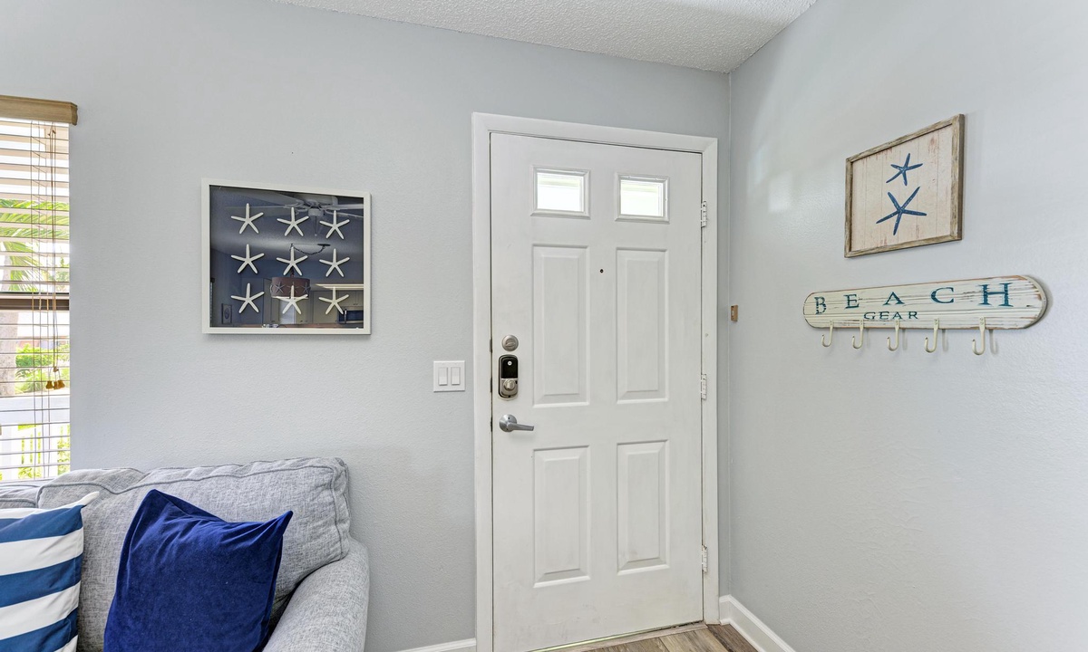 In the kitchen you’ll find all the basics for preparing meals including a dishwasher. The dining area can seat all six guests, or seat four at the kitchen breakfast counter. Off the living room and main entry you’ll find stairs leading into the front yard pool area.