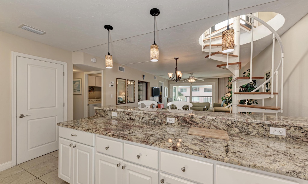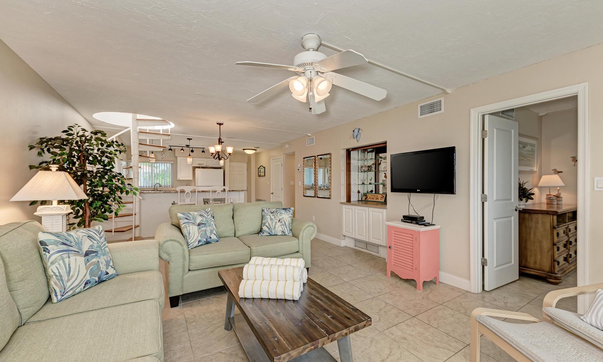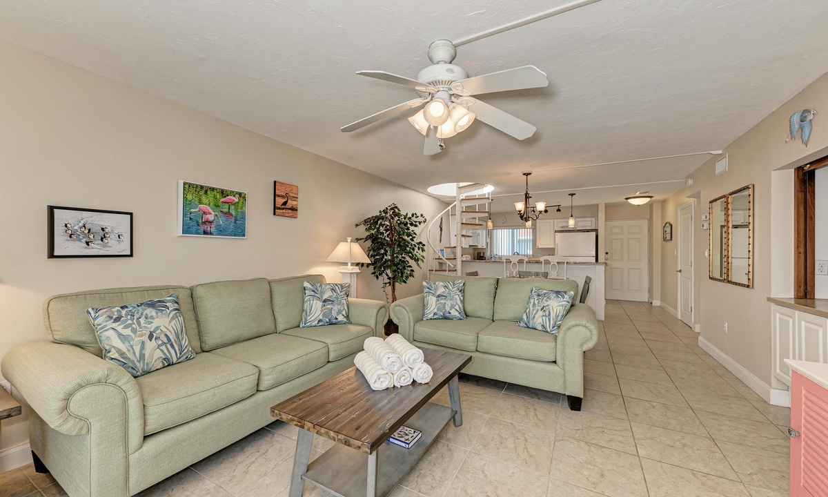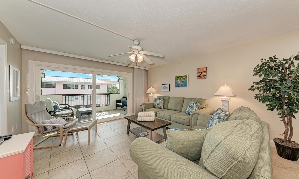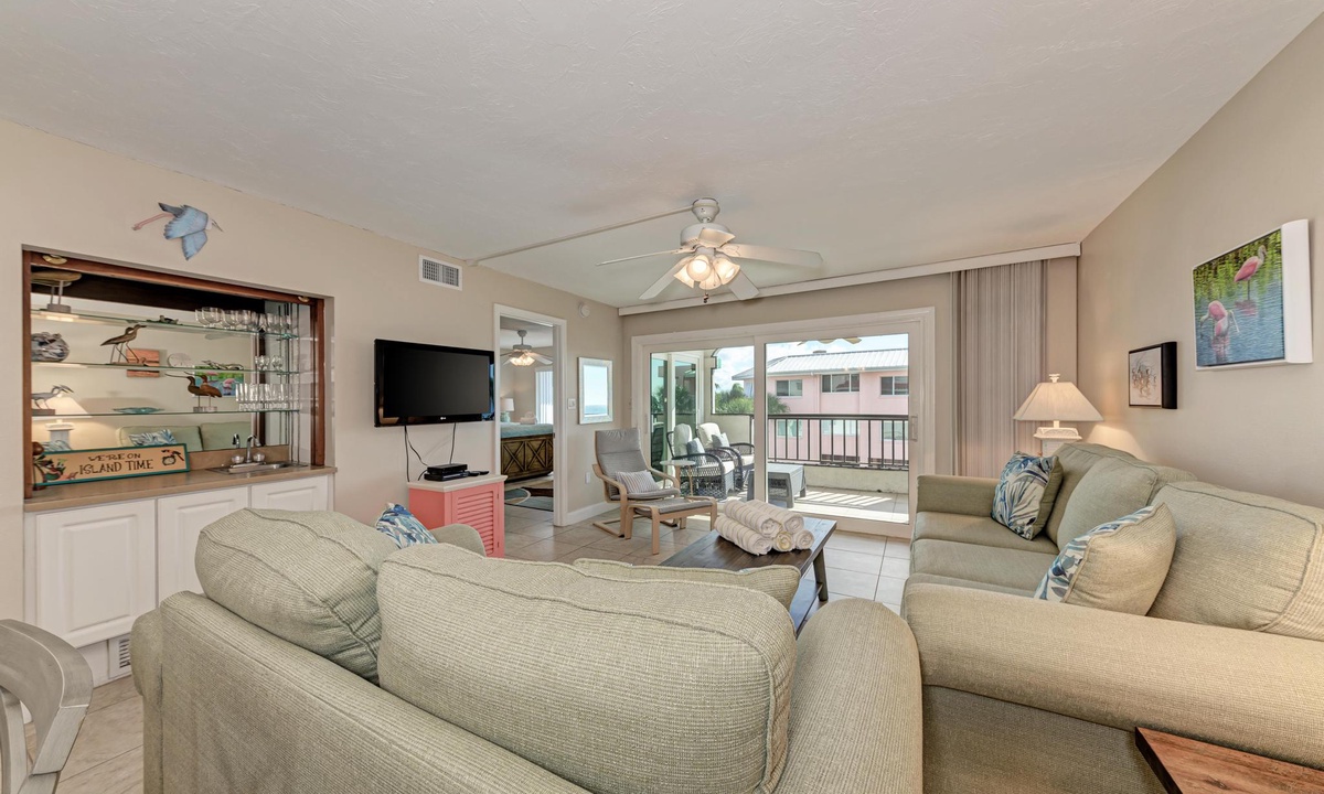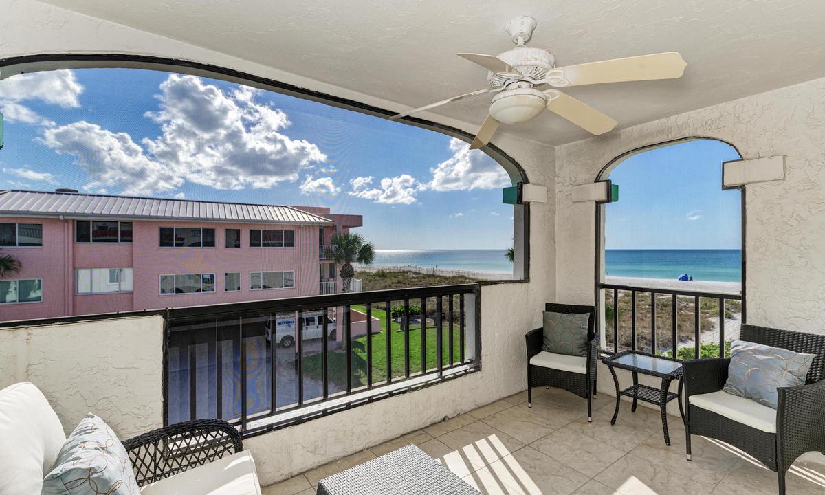 Double sliding doors in the living room open up onto the screened top floor lanai letting in the sound of waves and smell of fresh gulf air. Watch the sunset on the beach or right from the comfort of the living room!