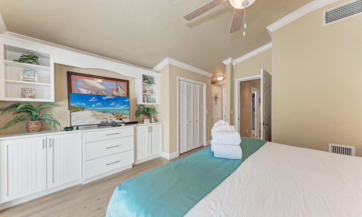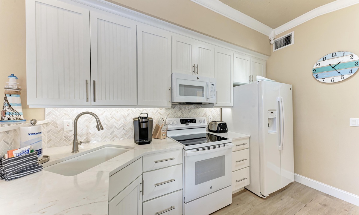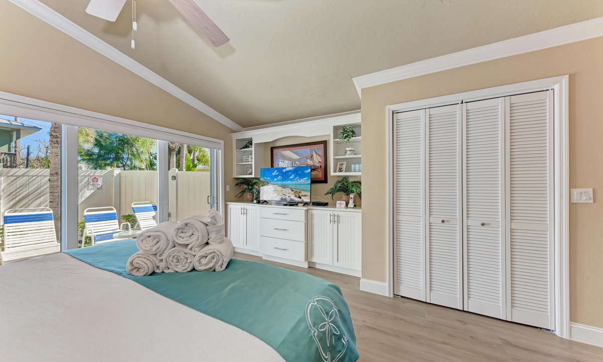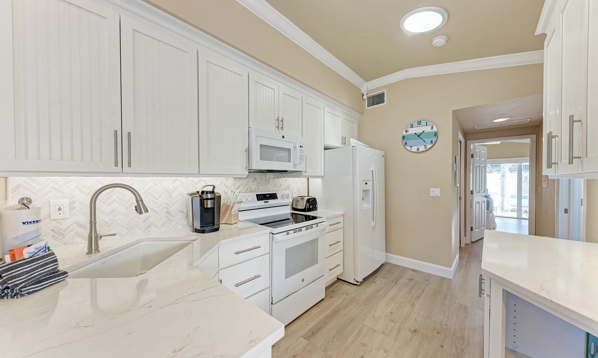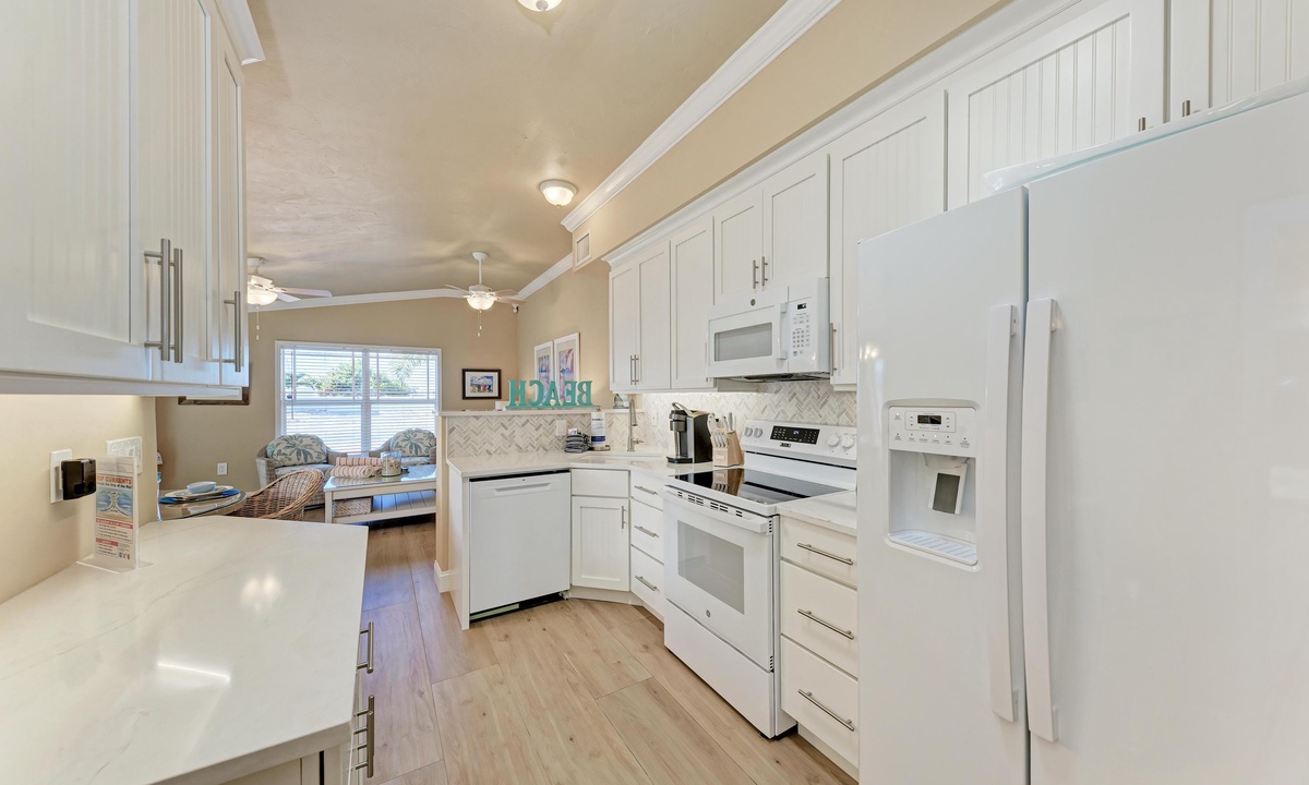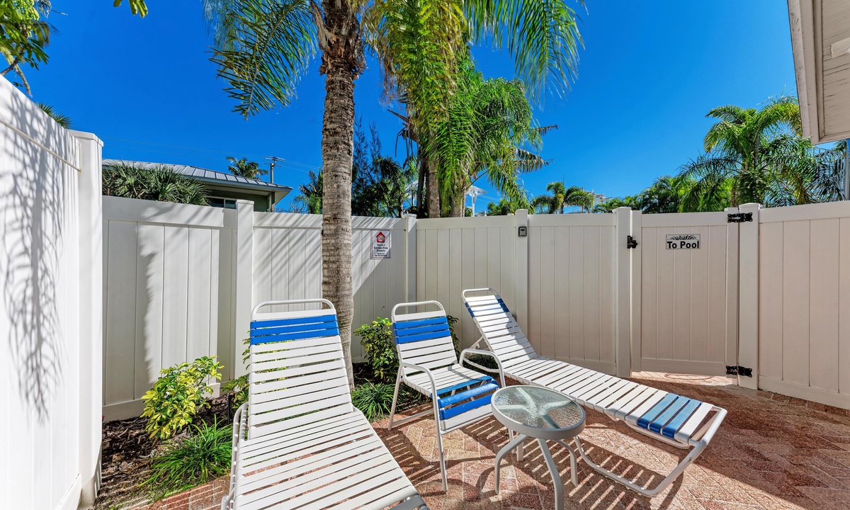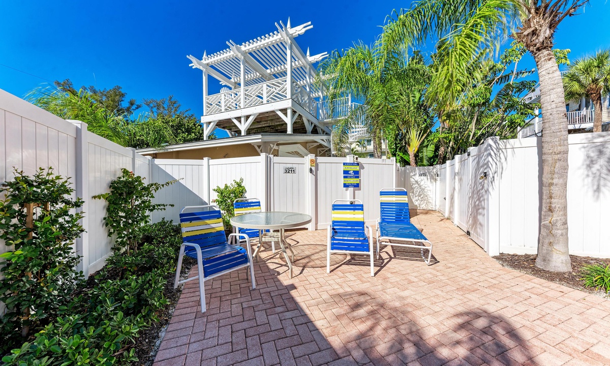 You’ll have plenty of privacy, sunshine, and space for your duration at PIV3211. The courtyards feature tall fences, lounge chairs, a propane grill and outdoor dining table with chairs (soon to be updated by mid-June). Sliding glass doors let you come and go with ease between the bedroom and great-room courtyards with your own gas BBQ grill, and spacious kitchen.