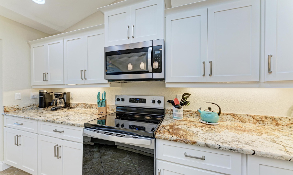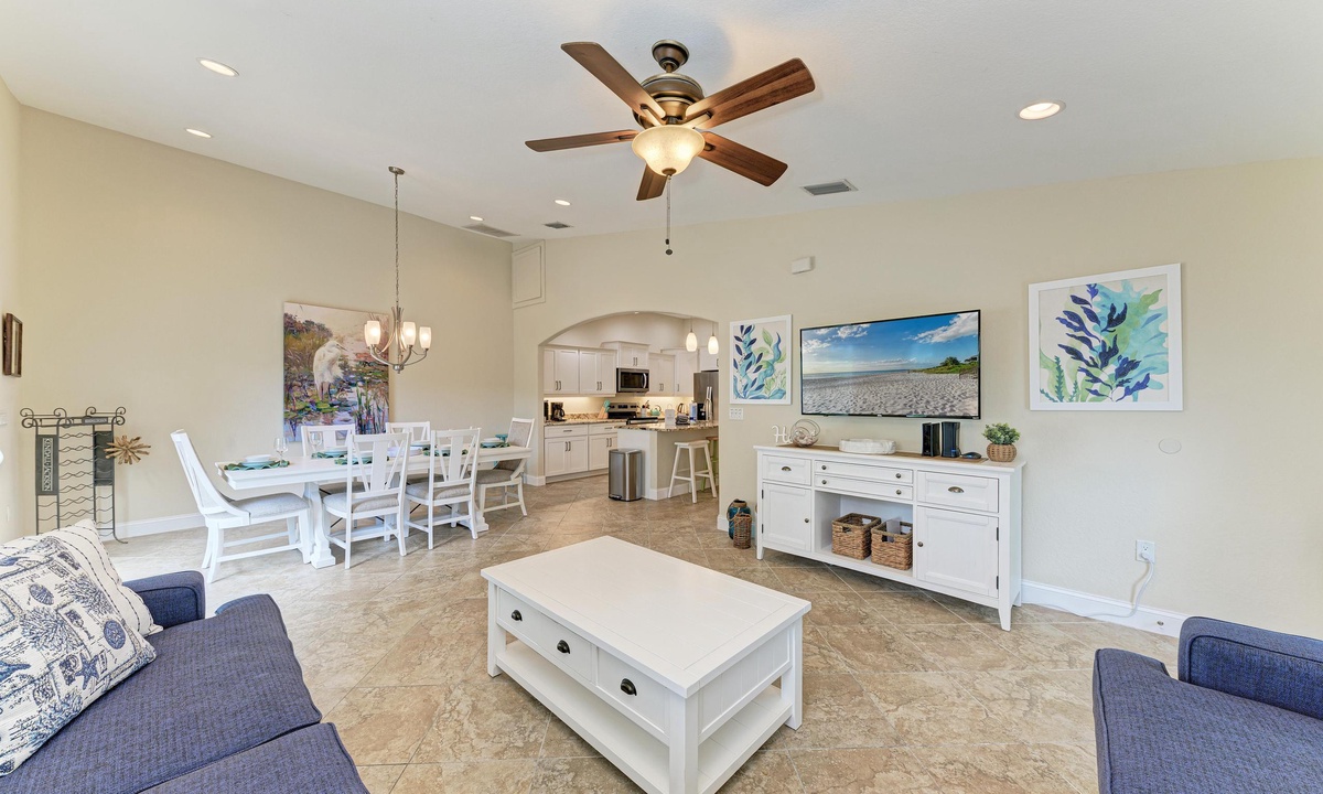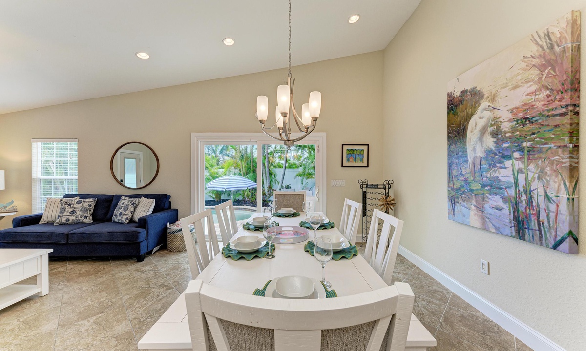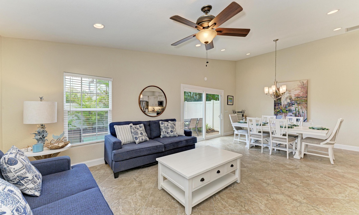 The kitchen, dining area and living room have an open floor plan perfect for entertaining. The kitchen is well equipped with stainless appliances including a dish washer. The cute dining area accommodates everyone comfortably for a family style sit down meal. Just off the comfortable furnished living room through sliding doors is the pool patio area including a propane grill perfect for preparing vacation style meals.