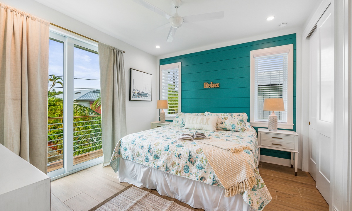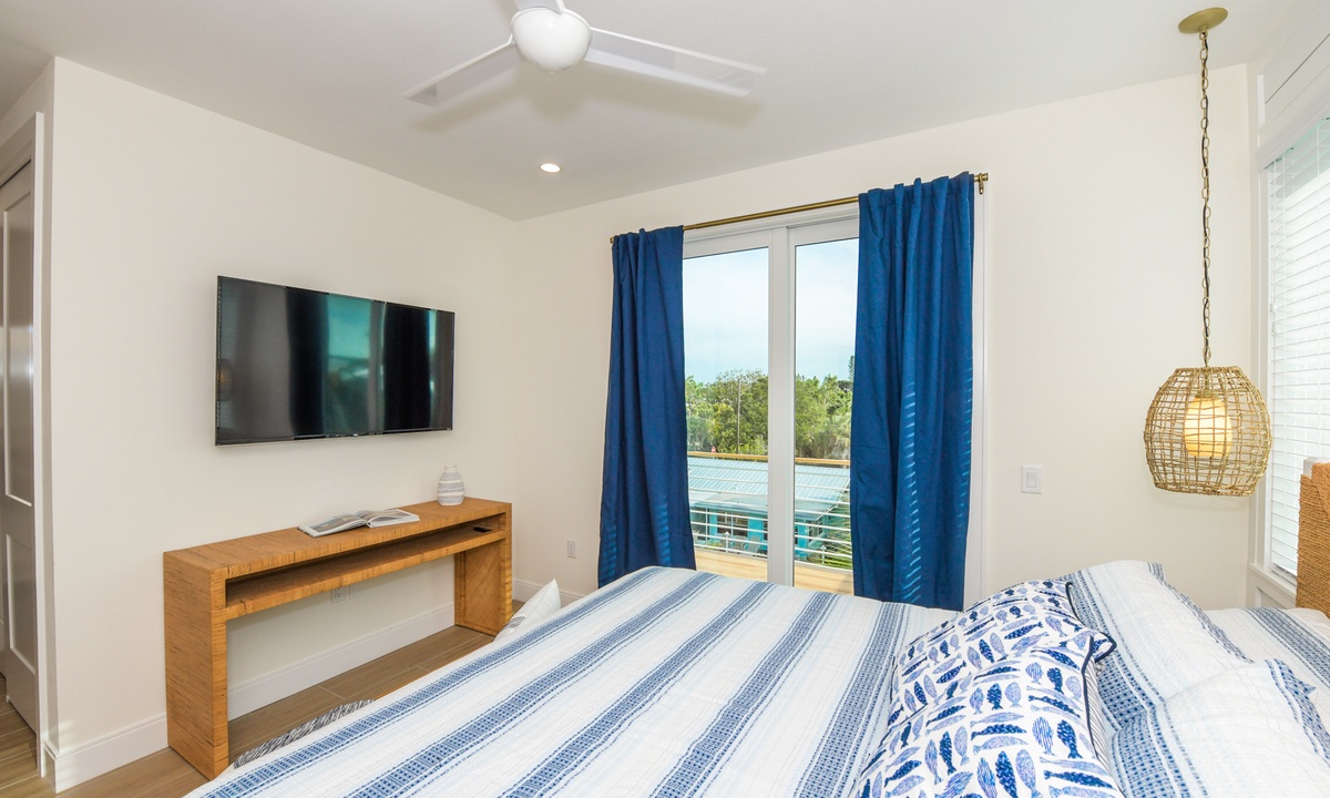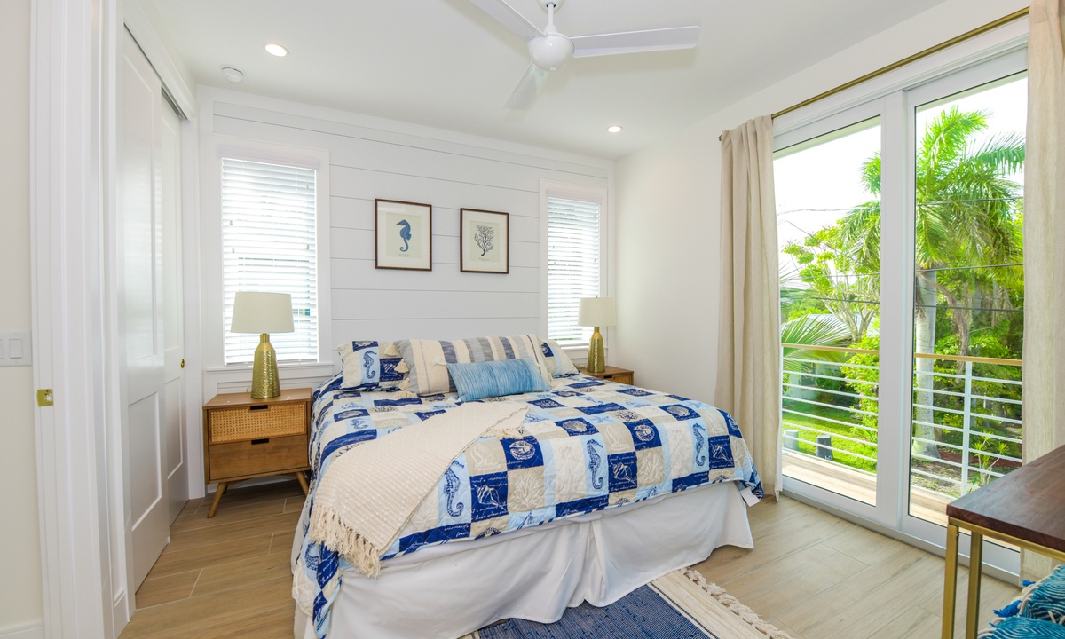 • Bedroom 2: King bed, ensuite bathroom with walk-in shower, balcony access