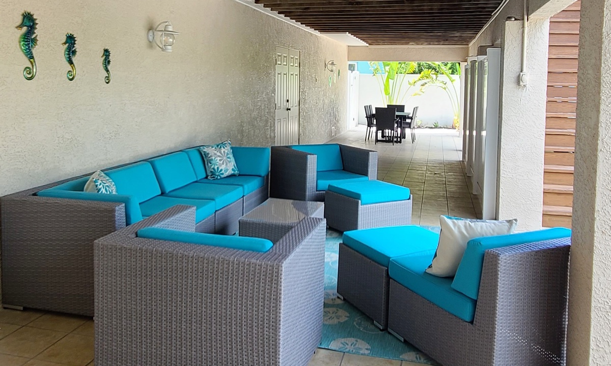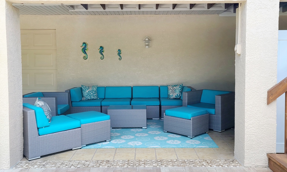 Enjoy lounging in the screened porch seating area in cushioned outdoor furniture, or in the covered area with grill at the back of the house. The perfect place for an afternoon libation or a relaxing book!