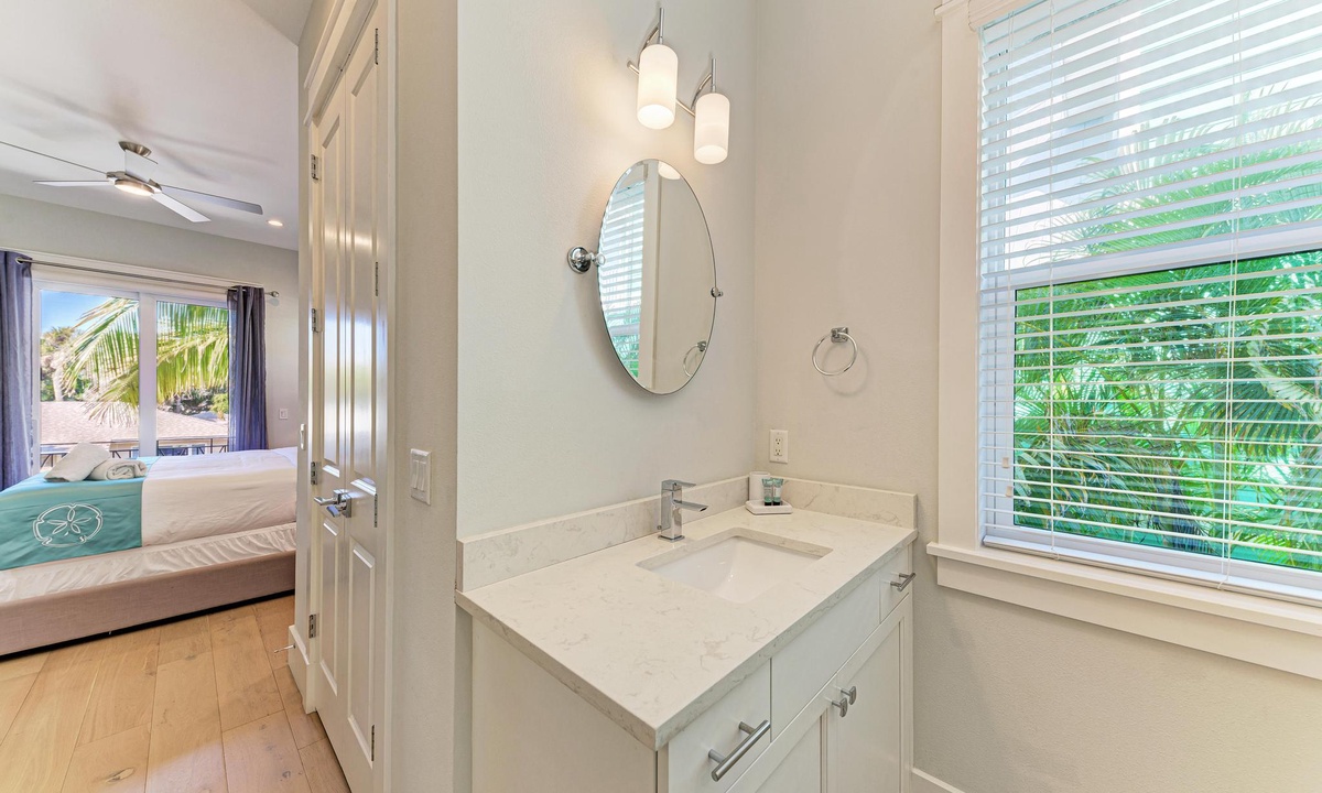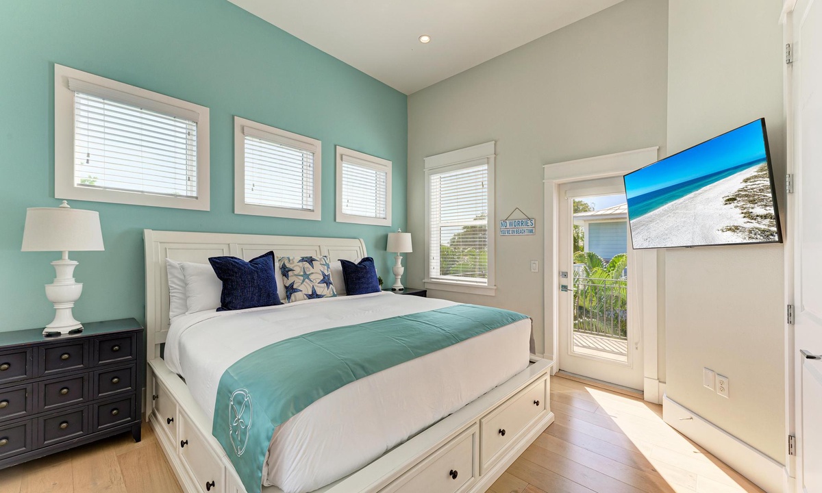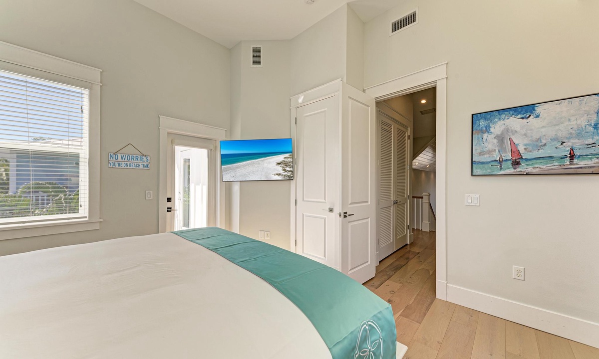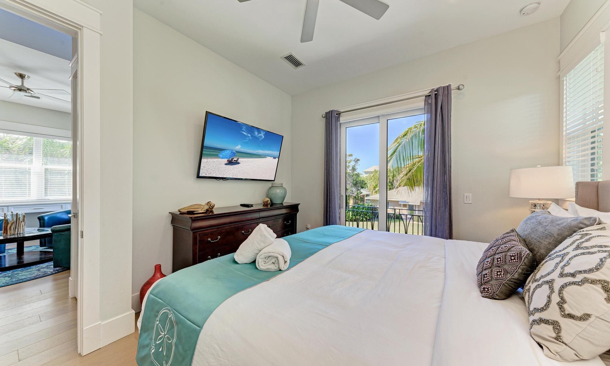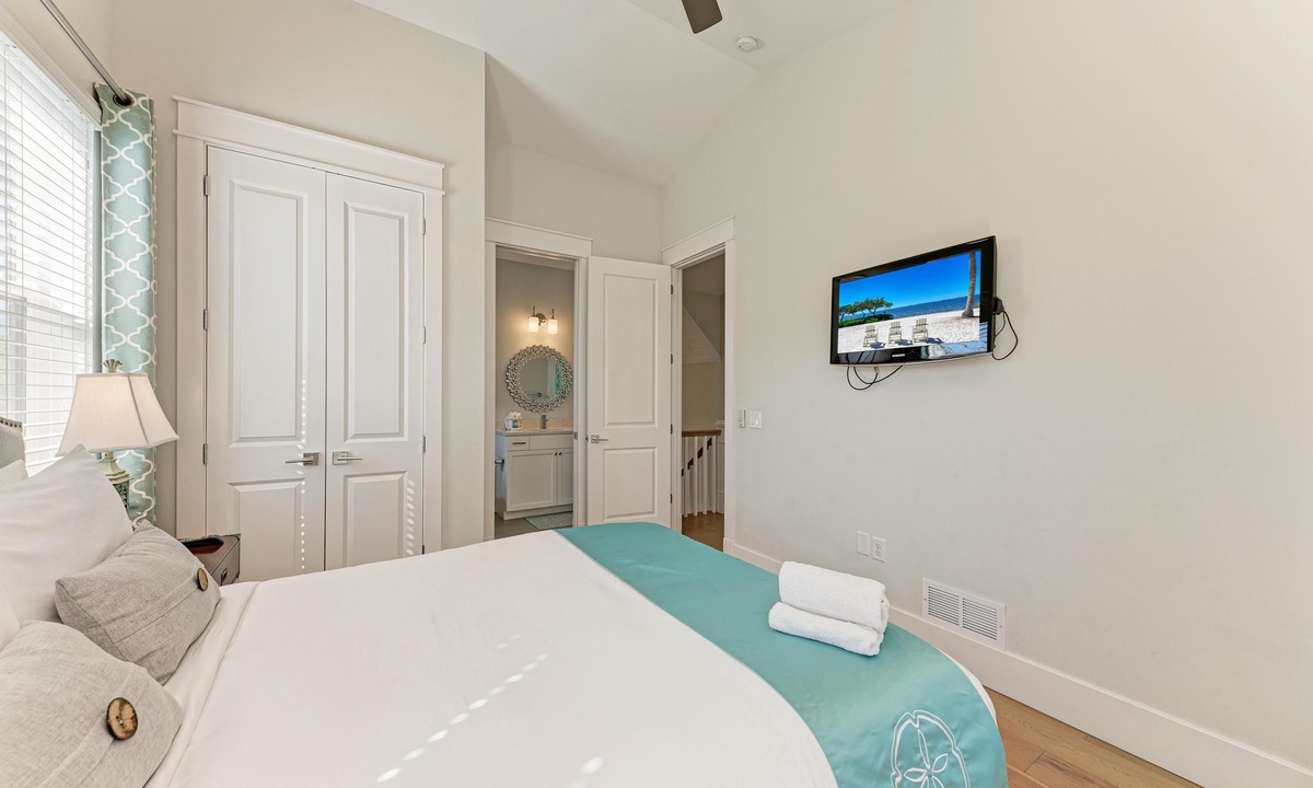 The 4th bedroom has a queen bed, TV, dresser, closet, and its own ensuite full bath with vanity and walk in shower. This bedroom also has access to the balcony overlooking the pool area.