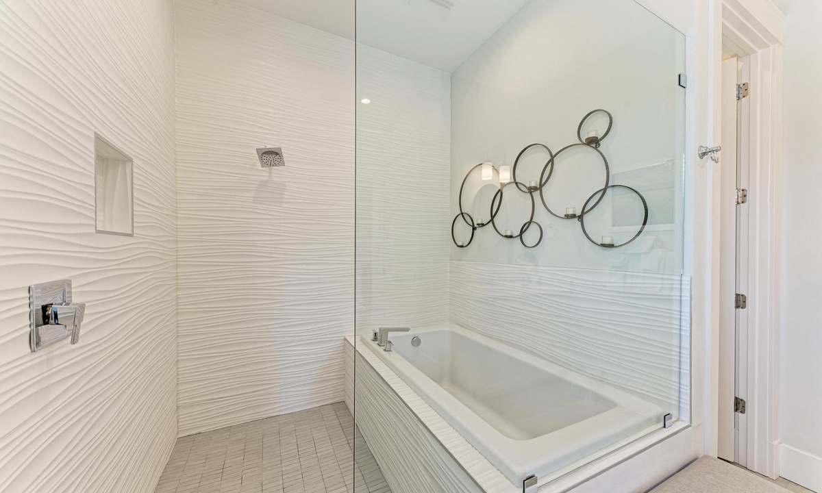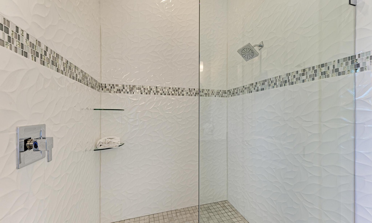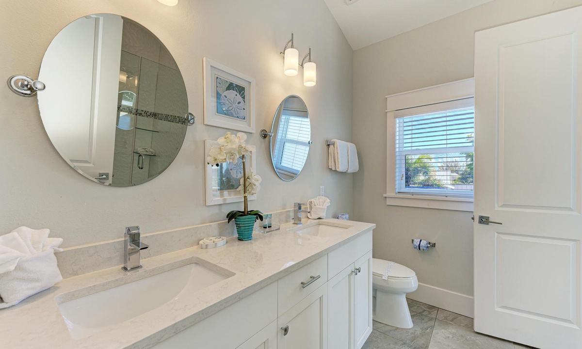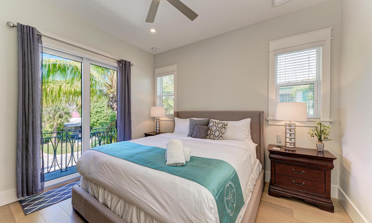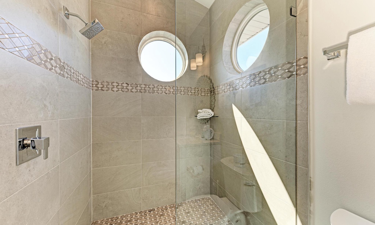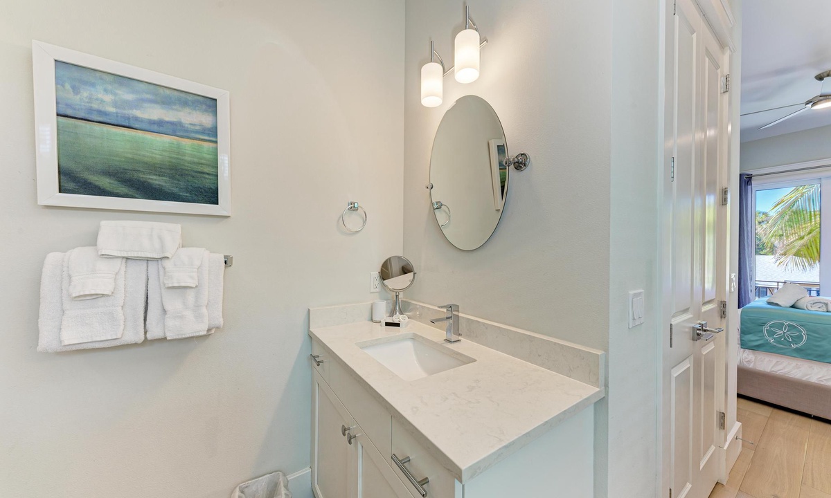 The 4th bedroom has a queen bed, TV, dresser, closet, and its own ensuite full bath with vanity and walk in shower. This bedroom also has access to the balcony overlooking the pool area.