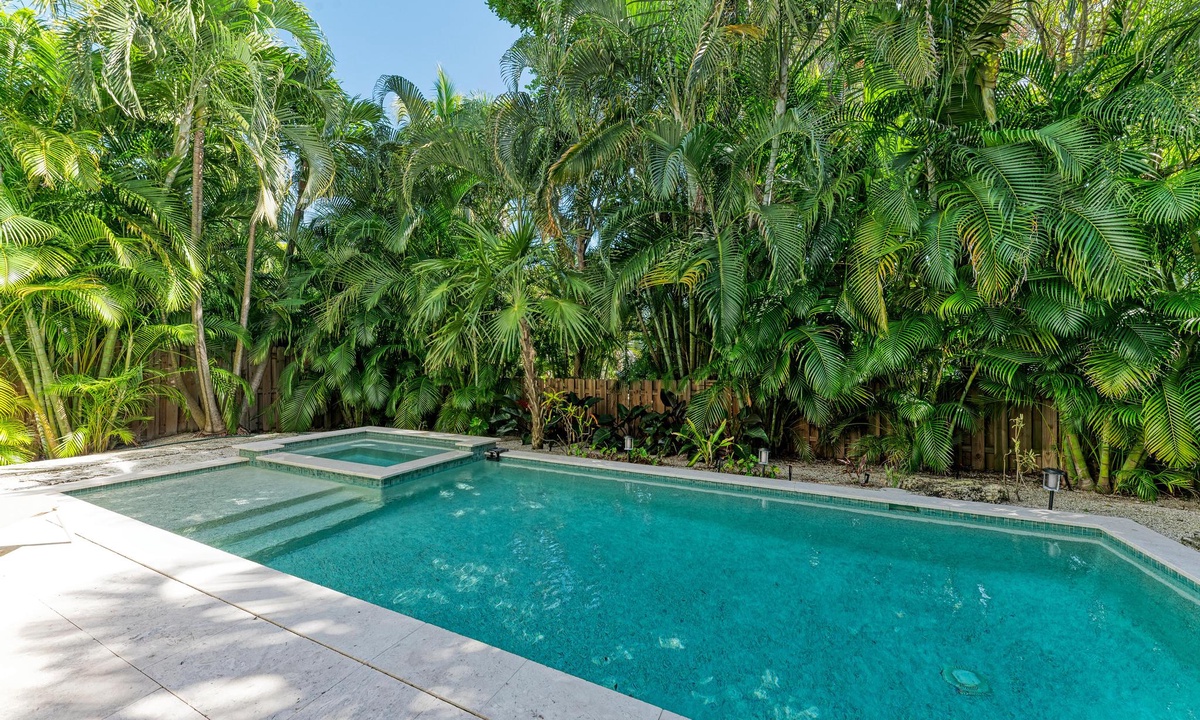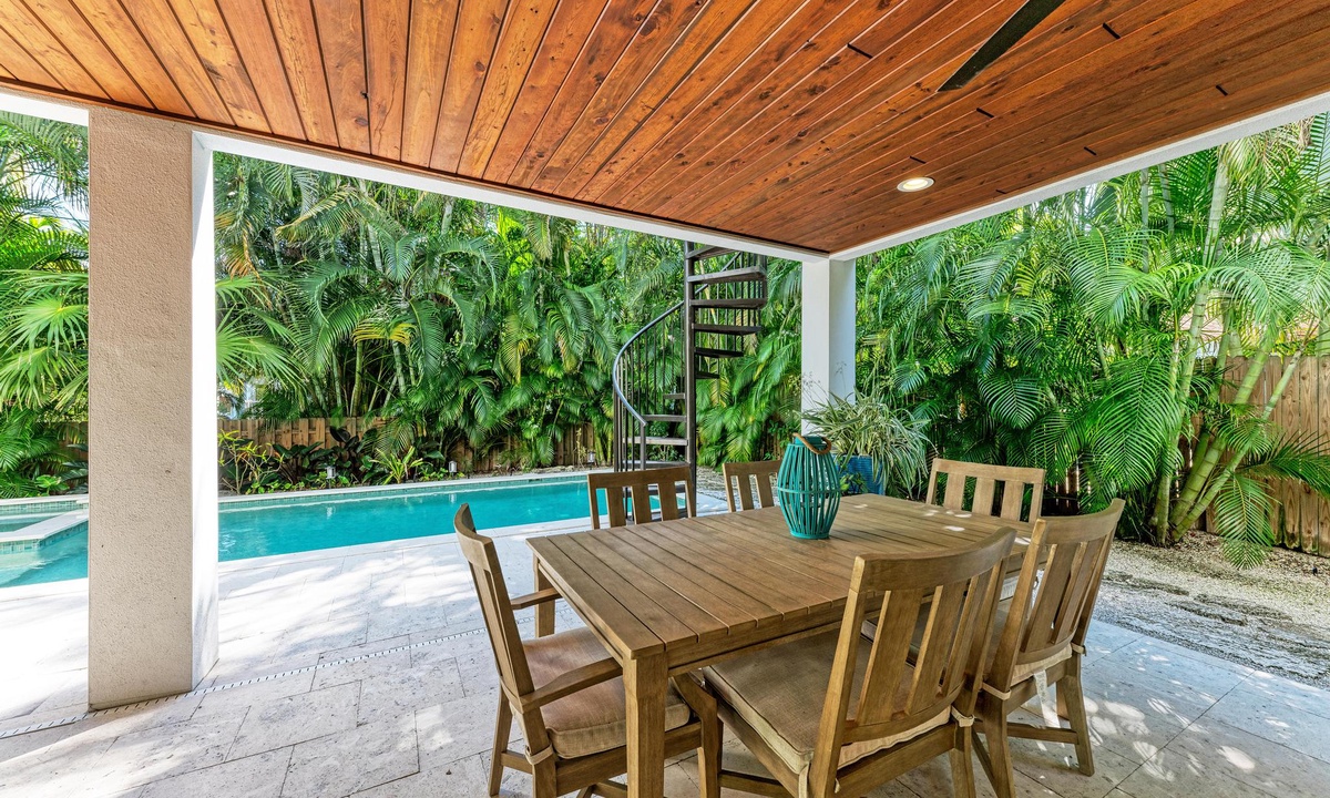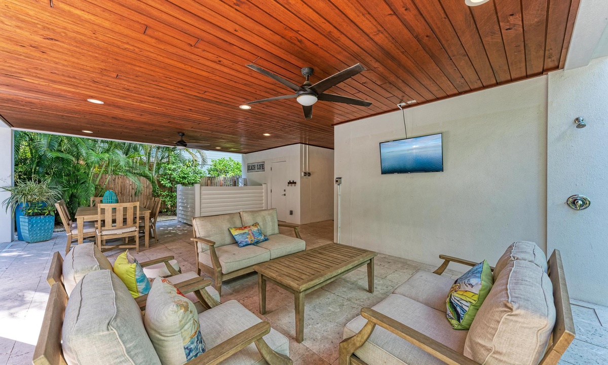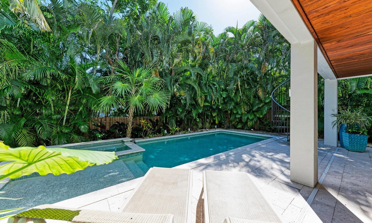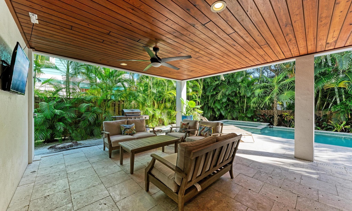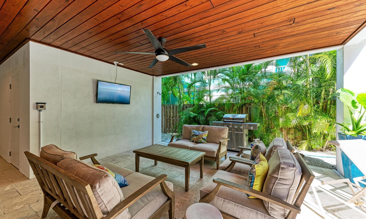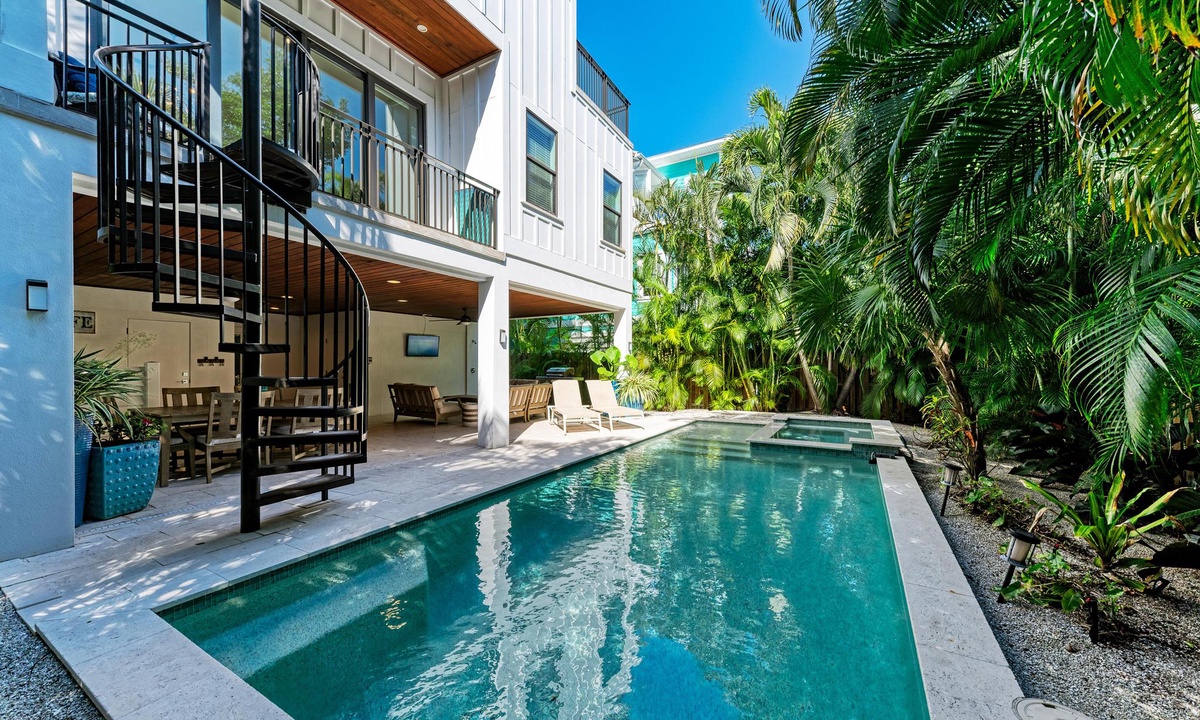 The home's ground floor has a one car garage and access to the gorgeous pool and patio areas in the beautifully landscaped backyard. The home has a sparkling spacious heated pool with spa that cascades gently into pool both of which get plenty of that Florida sunshine! The covered patio area has fans, luxury outdoor furnishings including table and chairs, seating area, large screen smart TV, and propane gas grill. Perfect for lounging by the pool, grilling up some freshly caught seafood, and catching a game!