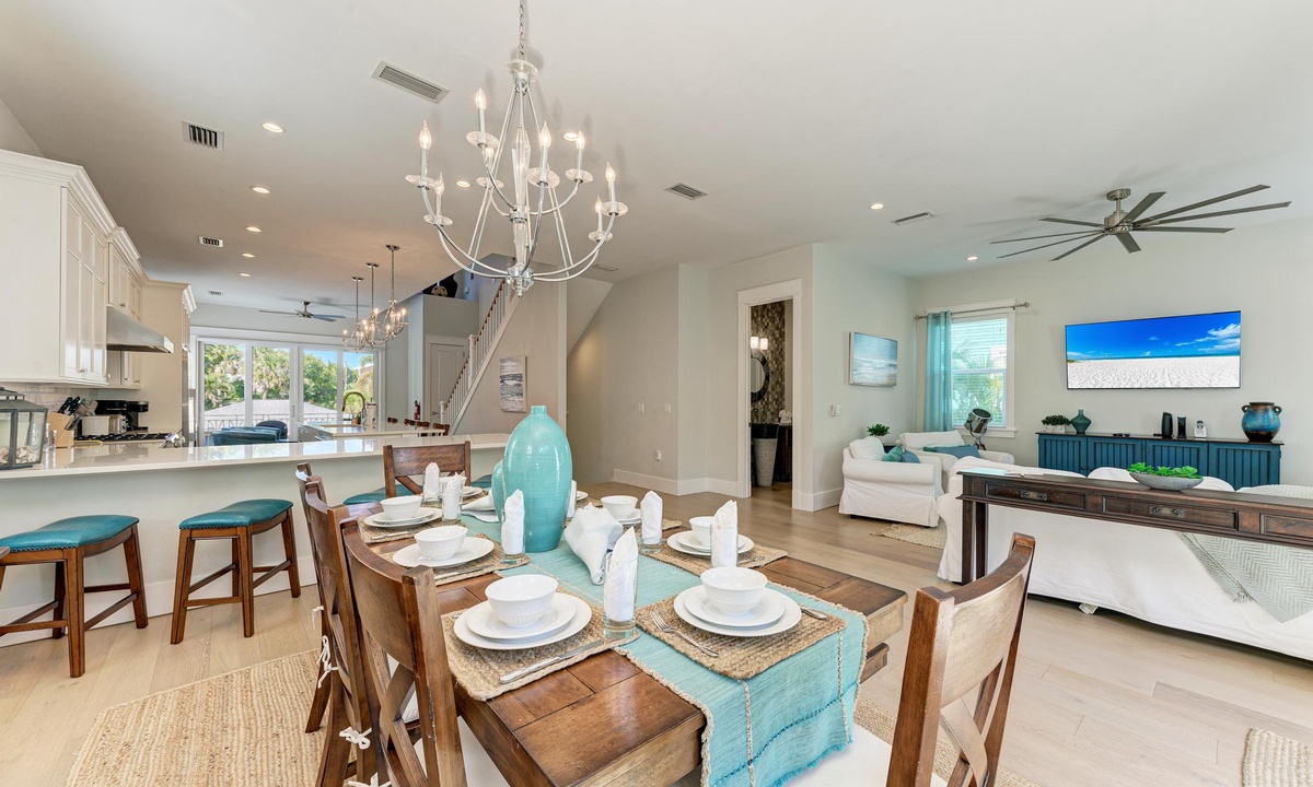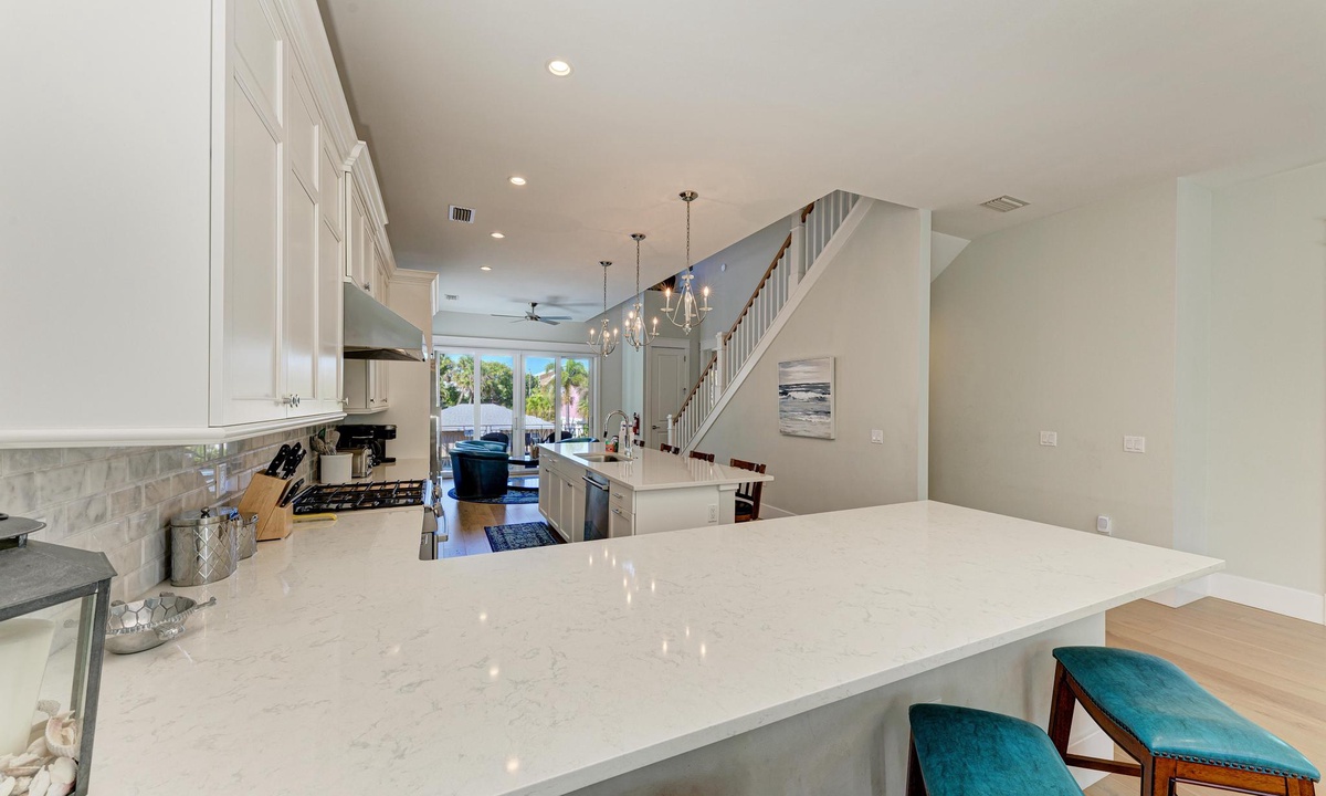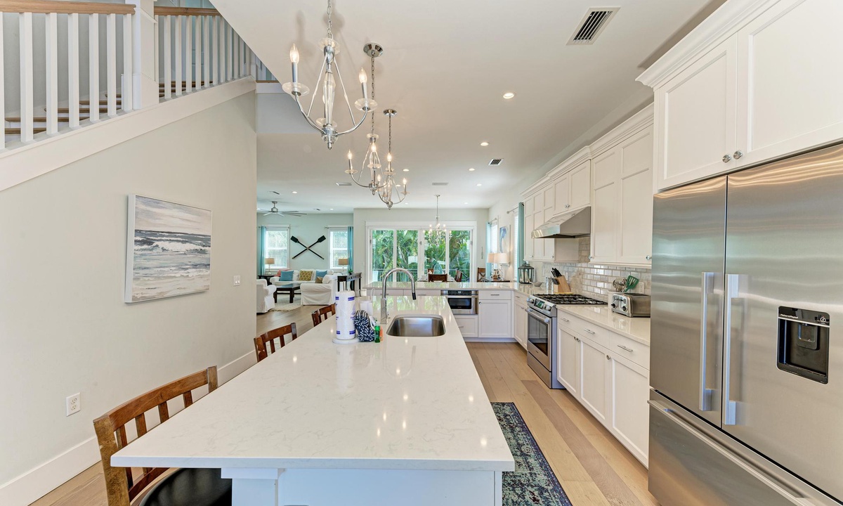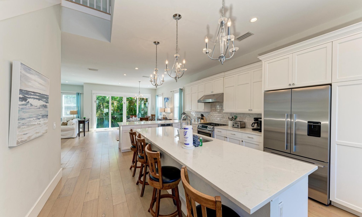 The home has hardwood floors and high-end appliances and touches throughout! The second or main floor has an open concept living, kitchen, and dining area. The kitchen is fully equipped for any amateur or professional chef to make a great meal at home including gas range and stove, large fridge and freezer, dishwasher, and microwave. There is dining seating for 8. As well as kitchen seating along the kitchen island and breakfast bar seating 8. The home has stainless steel appliances, as well as bar area with additional beverage/wine cooler. The home has plenty of seating in the living area with TV as well as an additional seating area for 4, perfect for reading or playing some games. The open living, kitchen, dining area open up to two porch balconies, one off the front of the home and one of the back overlooking the pool for enjoying those gulf-side breezes while sipping a coffee or cocktail! Also on the main floor is a king bedroom suite with dresser, TV, not just one but two walk in closets and a sprawling master bathroom ensuite with unique walk-in shower and tub, separate toilet room, and two separate vanities! There is also laundry and a half bath on the main floor as well.