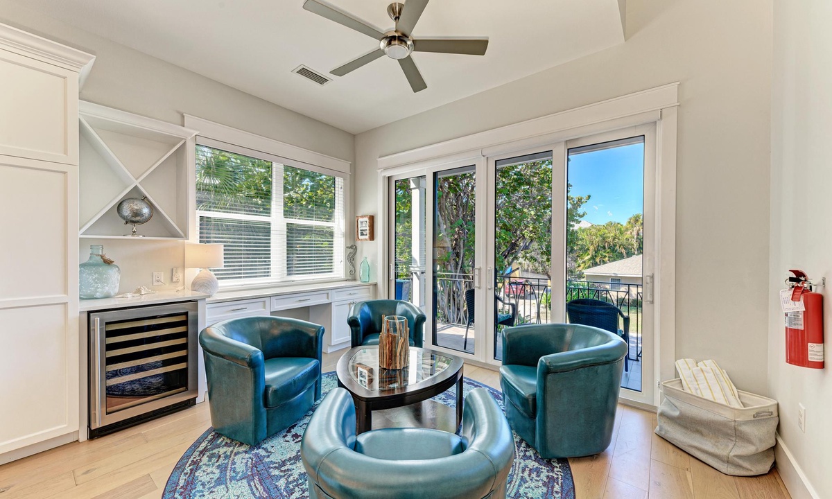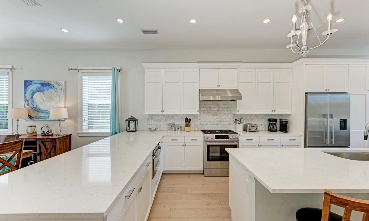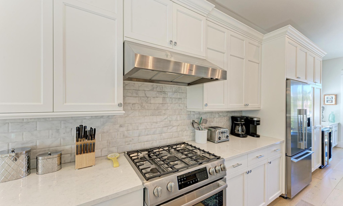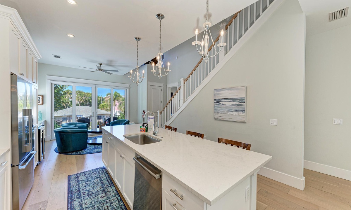 The home has hardwood floors and high-end appliances and touches throughout! The second or main floor has an open concept living, kitchen, and dining area. The kitchen is fully equipped for any amateur or professional chef to make a great meal at home including gas range and stove, large fridge and freezer, dishwasher, and microwave. There is dining seating for 8. As well as kitchen seating along the kitchen island and breakfast bar seating 8. The home has stainless steel appliances, as well as bar area with additional beverage/wine cooler. The home has plenty of seating in the living area with TV as well as an additional seating area for 4, perfect for reading or playing some games. The open living, kitchen, dining area open up to two porch balconies, one off the front of the home and one of the back overlooking the pool for enjoying those gulf-side breezes while sipping a coffee or cocktail! Also on the main floor is a king bedroom suite with dresser, TV, not just one but two walk in closets and a sprawling master bathroom ensuite with unique walk-in shower and tub, separate toilet room, and two separate vanities! There is also laundry and a half bath on the main floor as well.