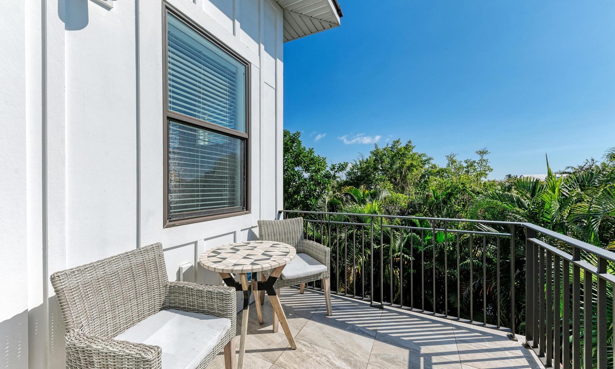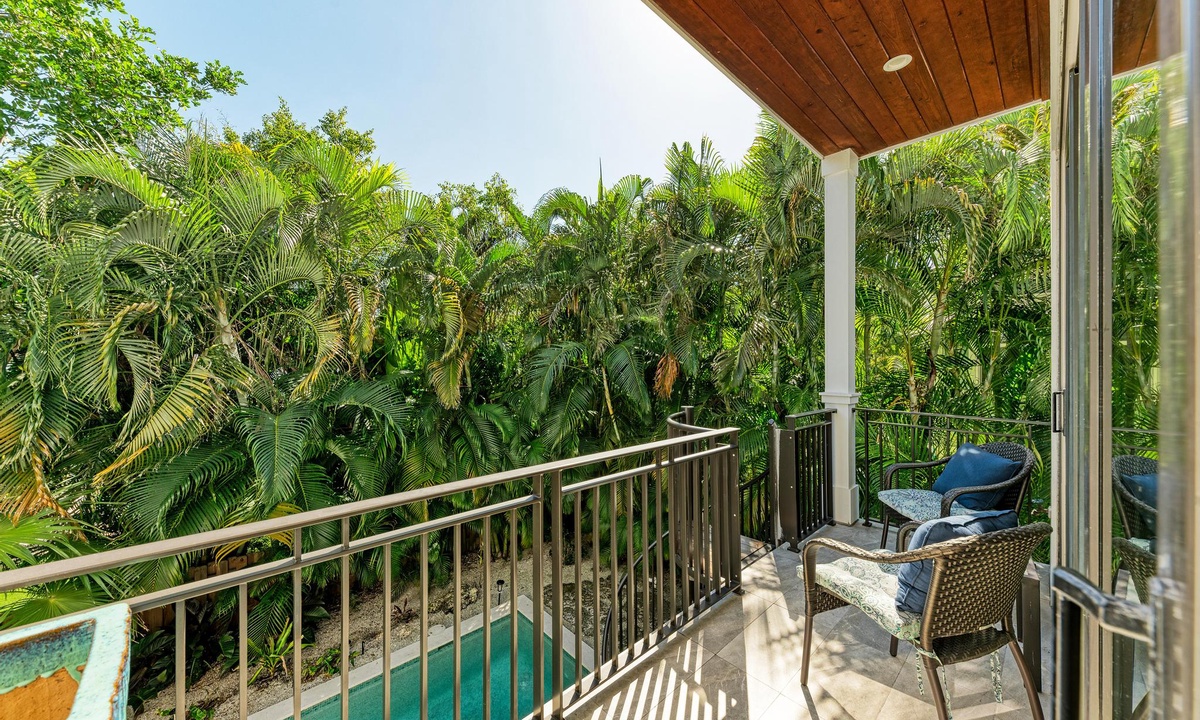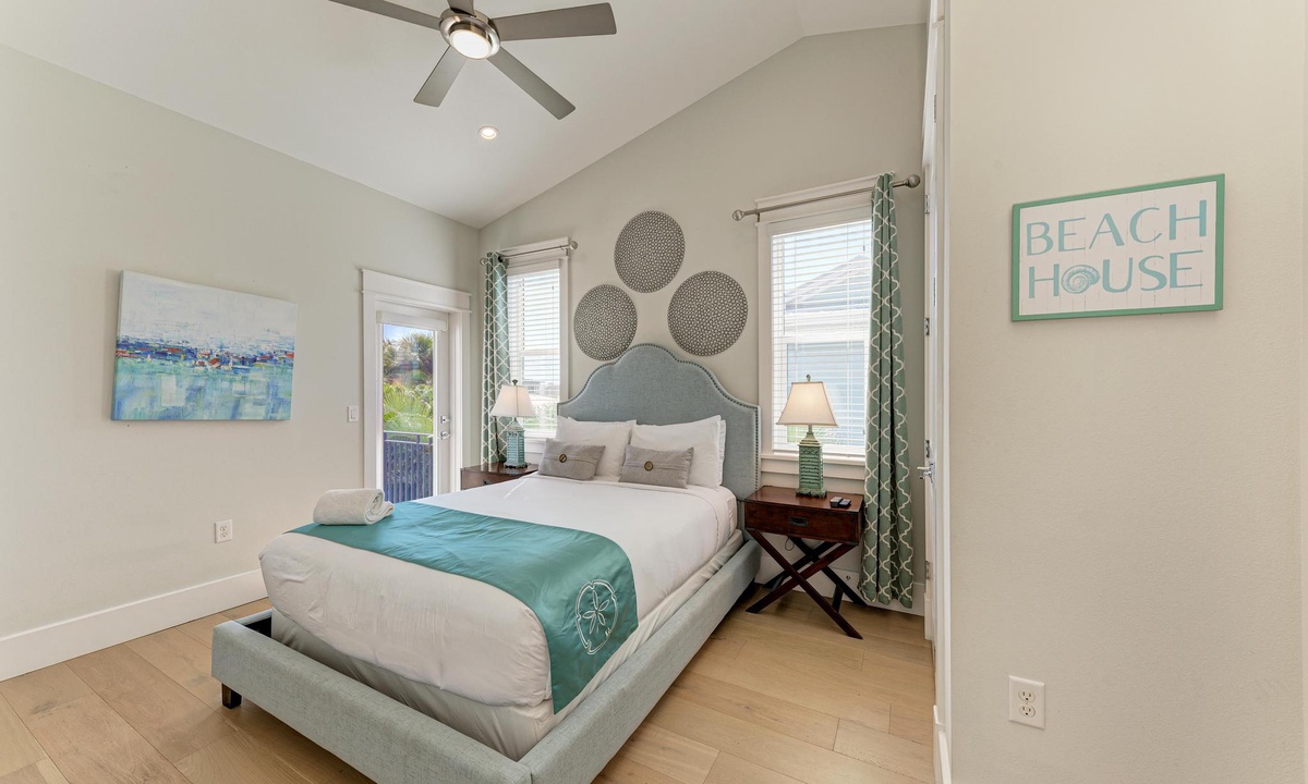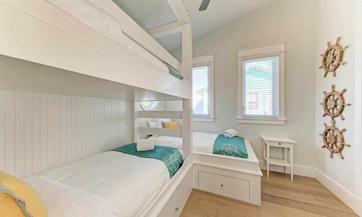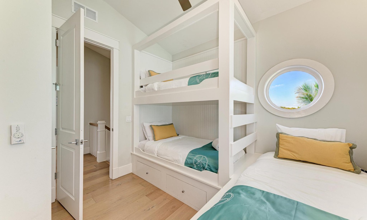 Wind your way upstairs you will find three additional bedrooms. The second bedroom has a king bed, TV, and access to balcony overlooking pool area and in a person spot to watch some stellar sunset colors across the sky. This bedroom connects to a jack-and-jill style bath with double vanity and walk in shower. This shared bathroom then also connects to the bunk room with adorably crafted and constructed custom bunks allow 3 to sleep comfortably in 3 separate beds.