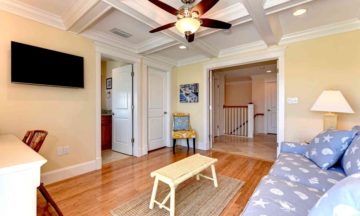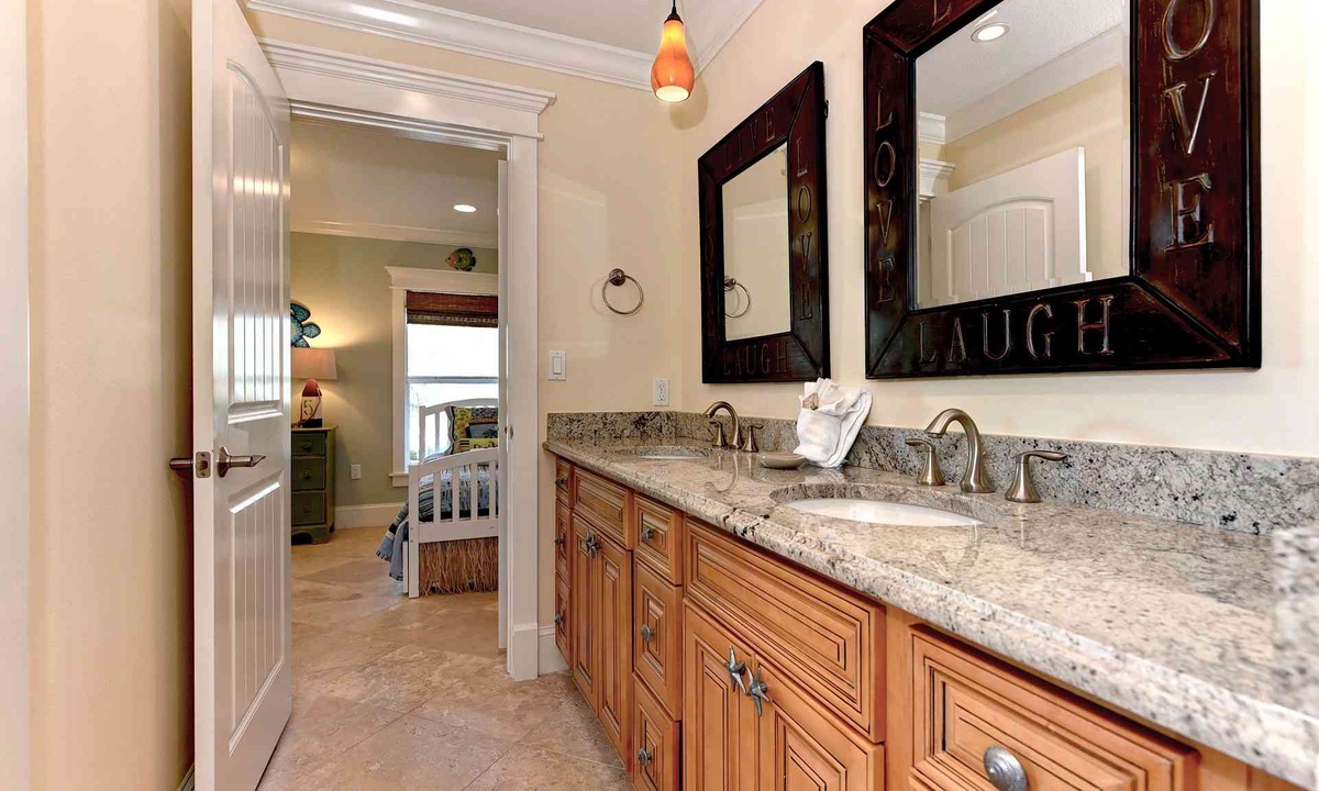 The kitchen, dining and living room have a great open floor plan to bring everyone together in the same place. In the kitchen you’ll find stainless steel appliances including a dishwasher plus four stools at the granite countertops. There is a smaller breakfast table seating four, or a large more formal dining table where everyone can sit and enjoy a home cooked meal. In the living room you’ll find a large flat screen television and a balcony overlooking the front of the house with peeks of the gulf.