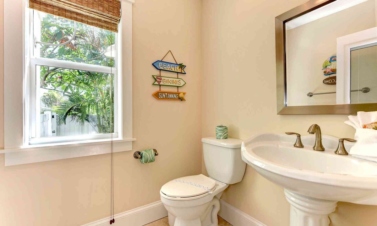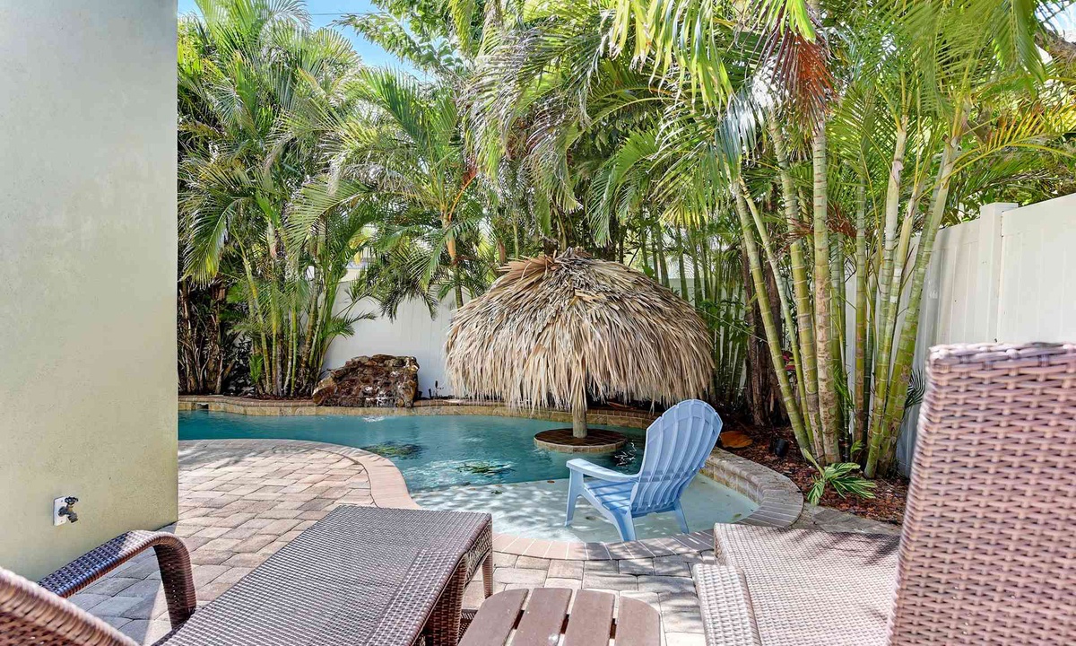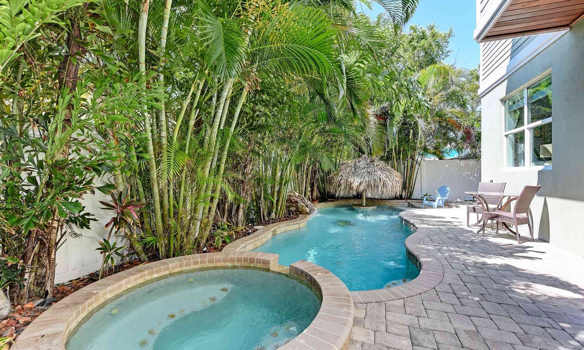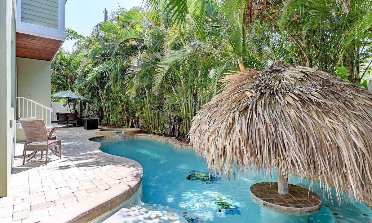 In the backyard at this Anna Maria Island vacation rental you’ll love the gorgeous spa and heated pool with a fun tiki umbrella. Relax in the great patio furniture among lush manicured landscaping. There is even a bathroom located off the pool area for your convenience. This backyard island oasis is the perfect spot for a family cookout with a propane grill and fresh gulf breezes.