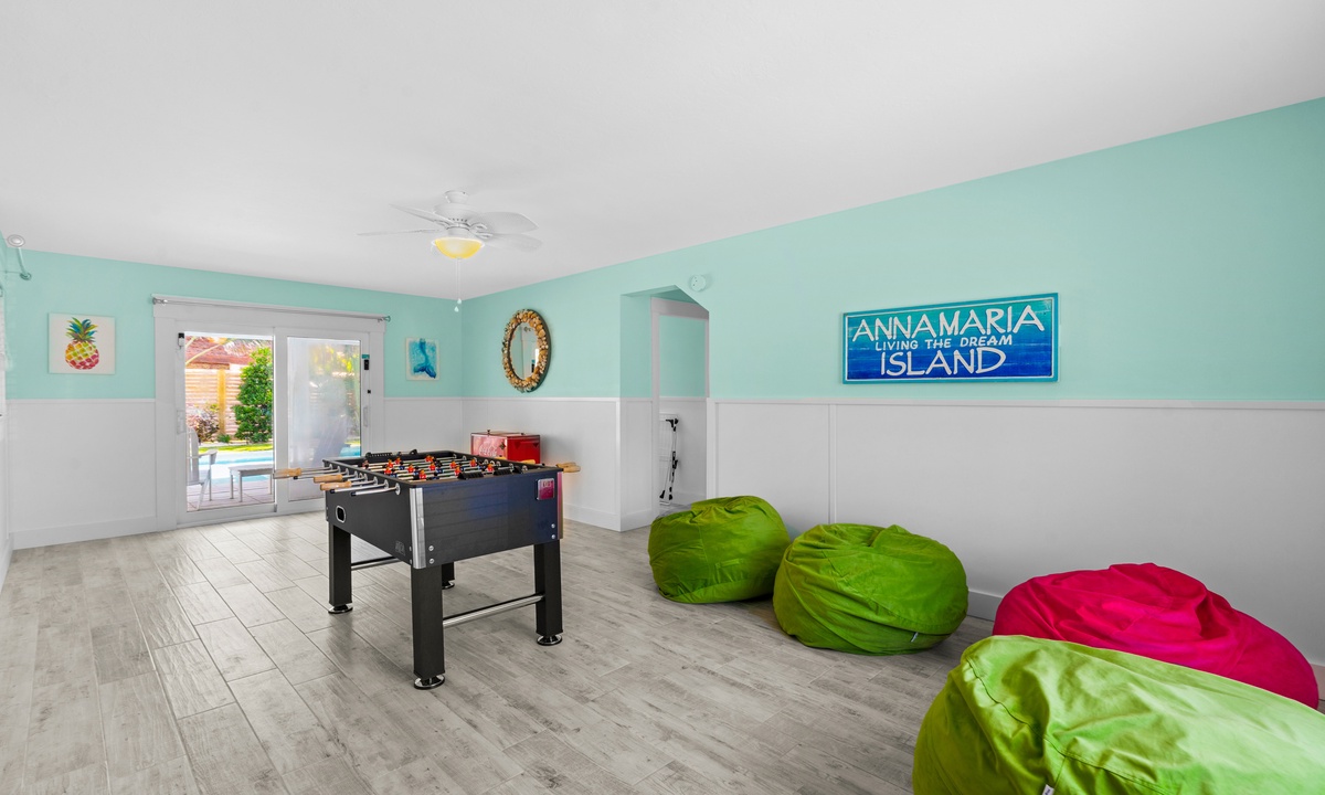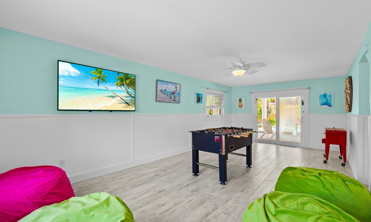 On the ground level next to the pool you can enjoy the foosball table or stretch out on a large sofa from where you can watch the TV or use one of the many board games.
