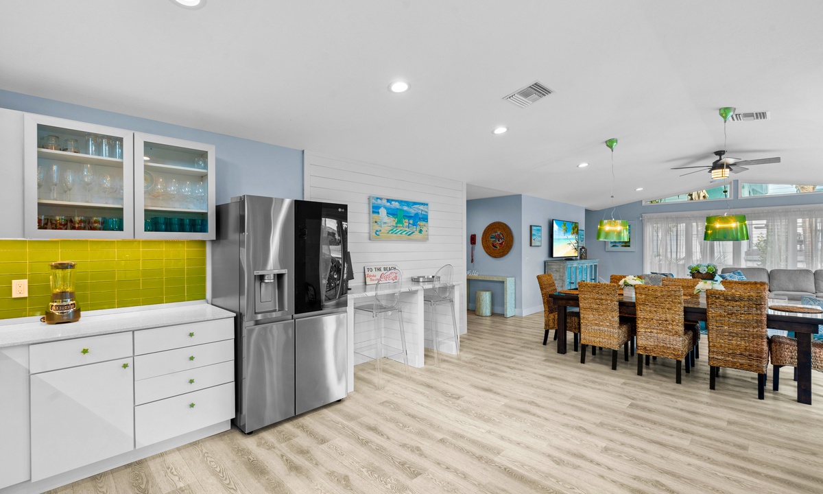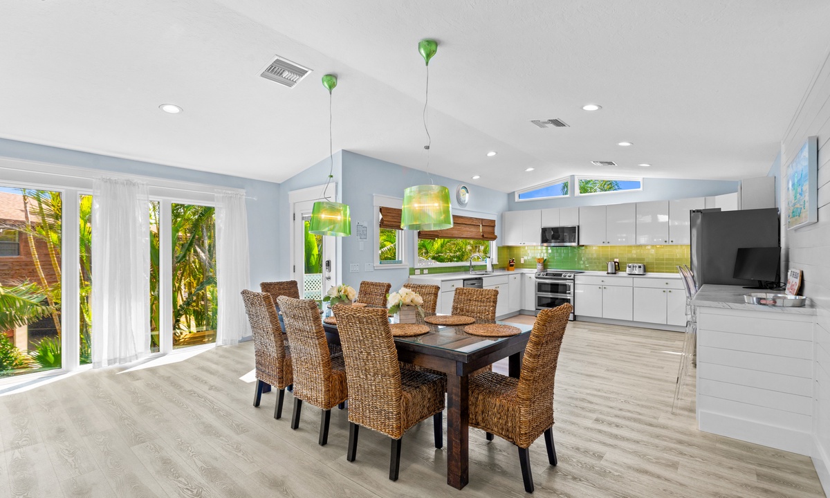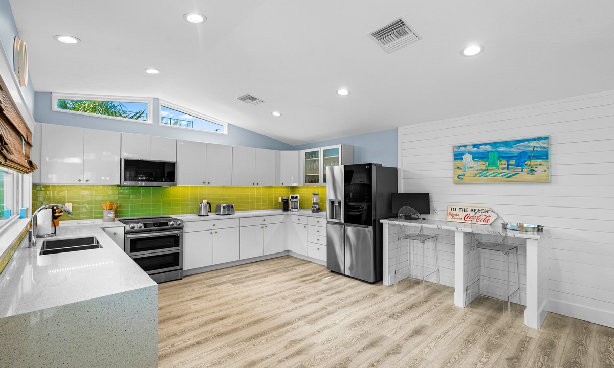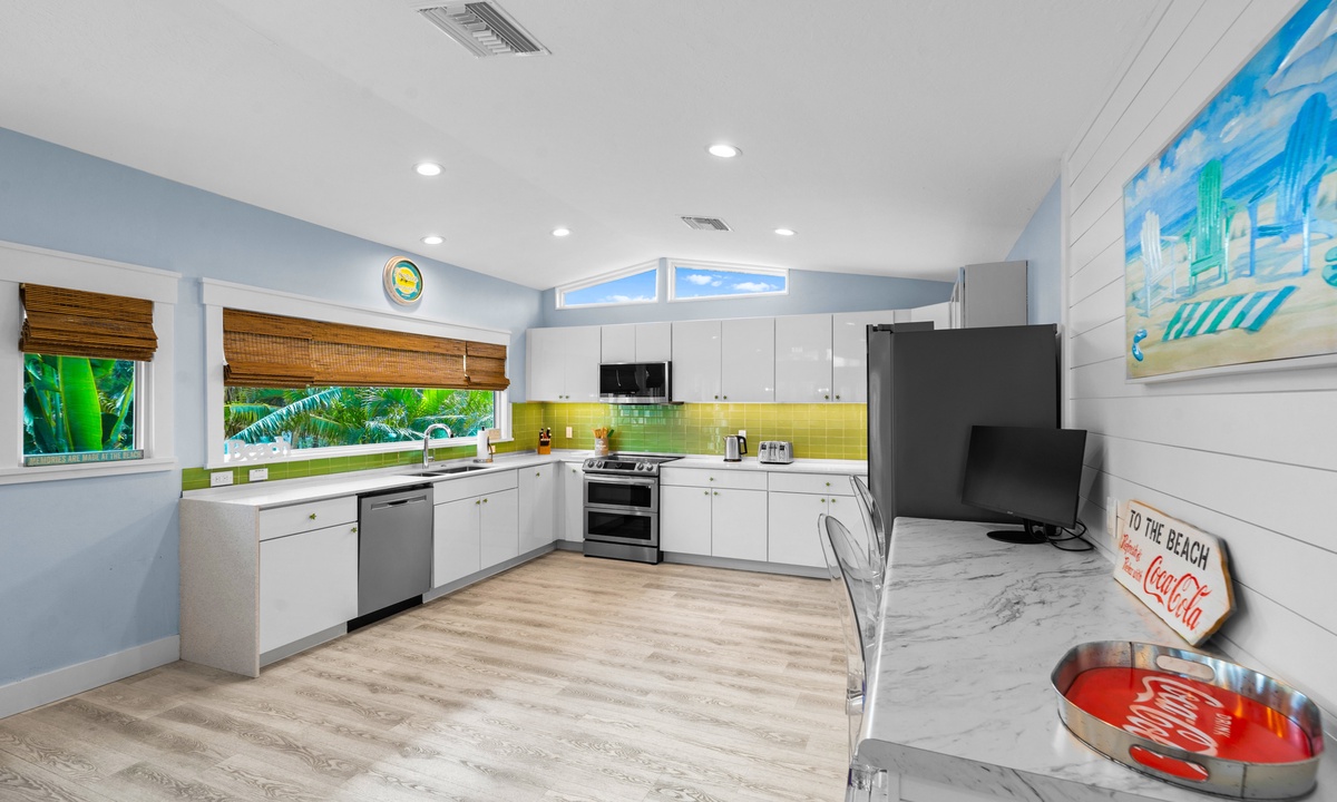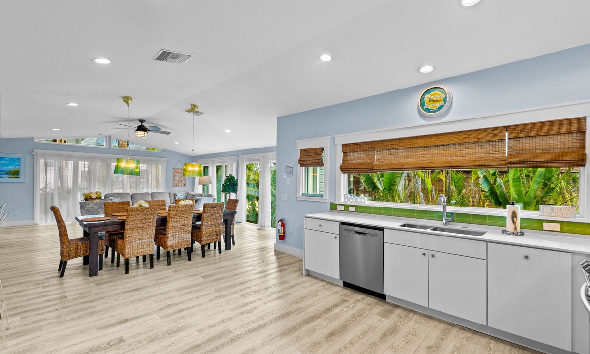 The house underwent a complete remodel. A brand new kitchen with a exquisite sparkling quartz kitchen countertop was just added. The kitchen is fully equipped, modern stain-less steel appliances make preparing meals effortless. The open floor plan ensures ample space for gatherings, whether it’s around the glass-covered American Oak dining table with 8 chairs, or the spacious living area with an inviting L-shaped sofa with 2 extra arm-chairs.