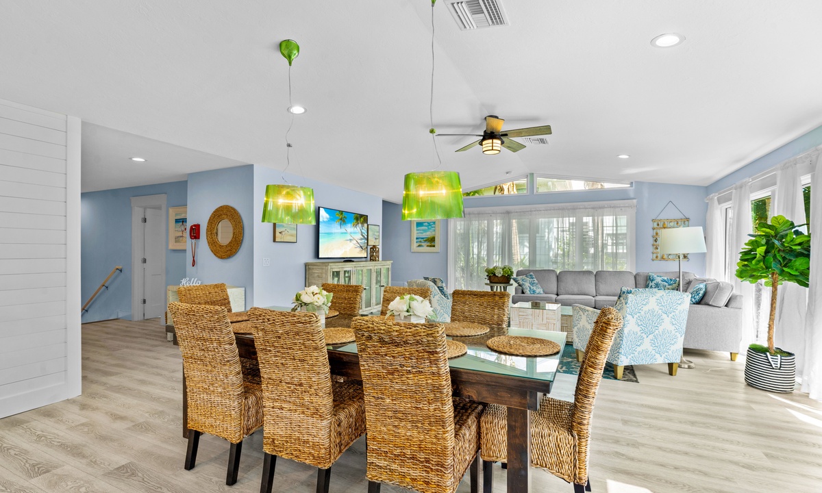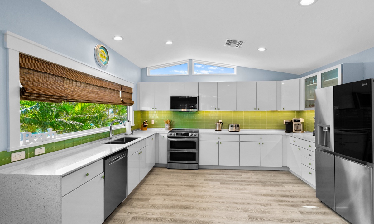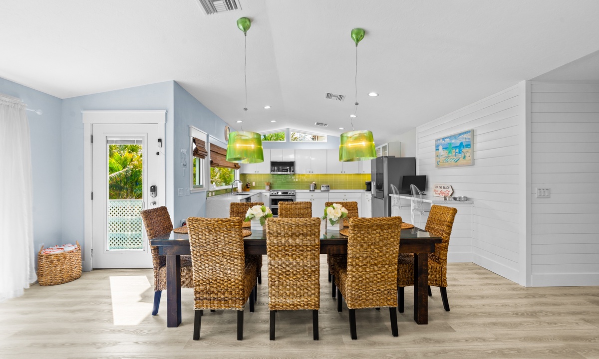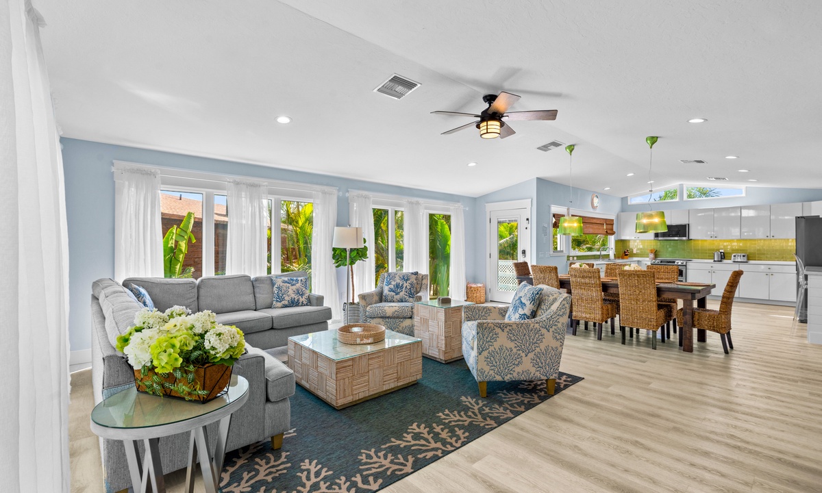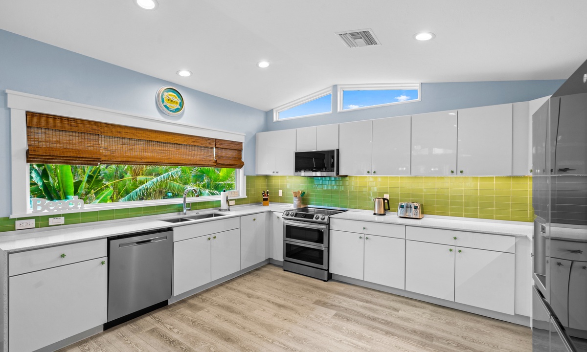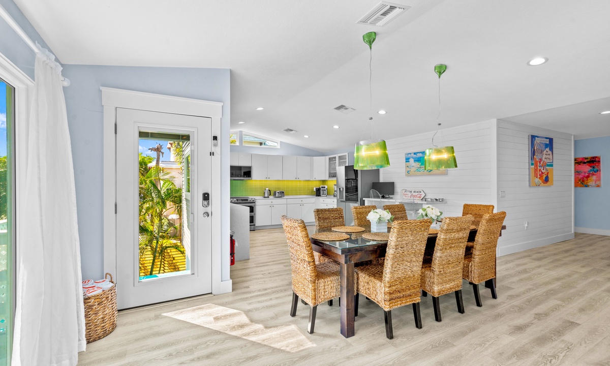 The house underwent a complete remodel. A brand new kitchen with a exquisite sparkling quartz kitchen countertop was just added. The kitchen is fully equipped, modern stain-less steel appliances make preparing meals effortless. The open floor plan ensures ample space for gatherings, whether it’s around the glass-covered American Oak dining table with 8 chairs, or the spacious living area with an inviting L-shaped sofa with 2 extra arm-chairs.