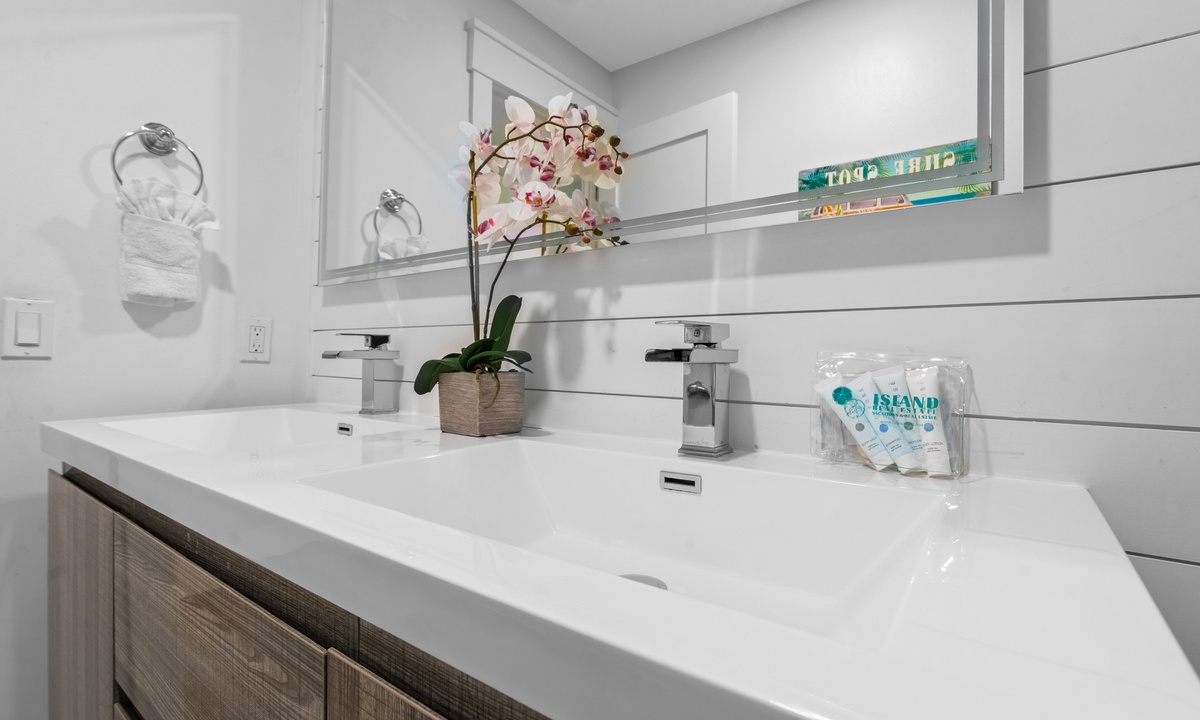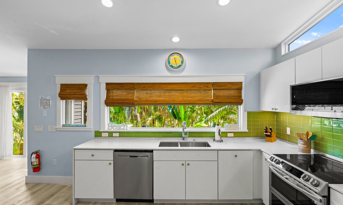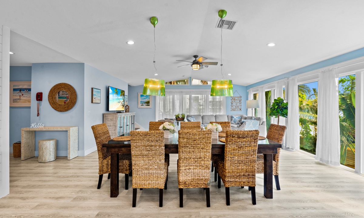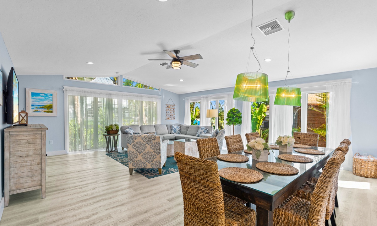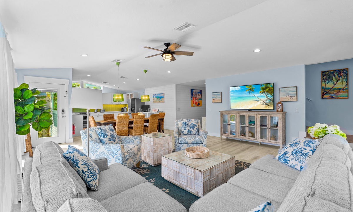 The house underwent a complete remodel. A brand new kitchen with a exquisite sparkling quartz kitchen countertop was just added. The kitchen is fully equipped, modern stain-less steel appliances make preparing meals effortless. The open floor plan ensures ample space for gatherings, whether it’s around the glass-covered American Oak dining table with 8 chairs, or the spacious living area with an inviting L-shaped sofa with 2 extra arm-chairs.