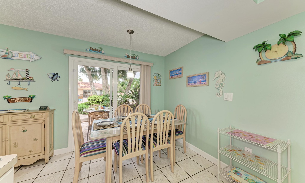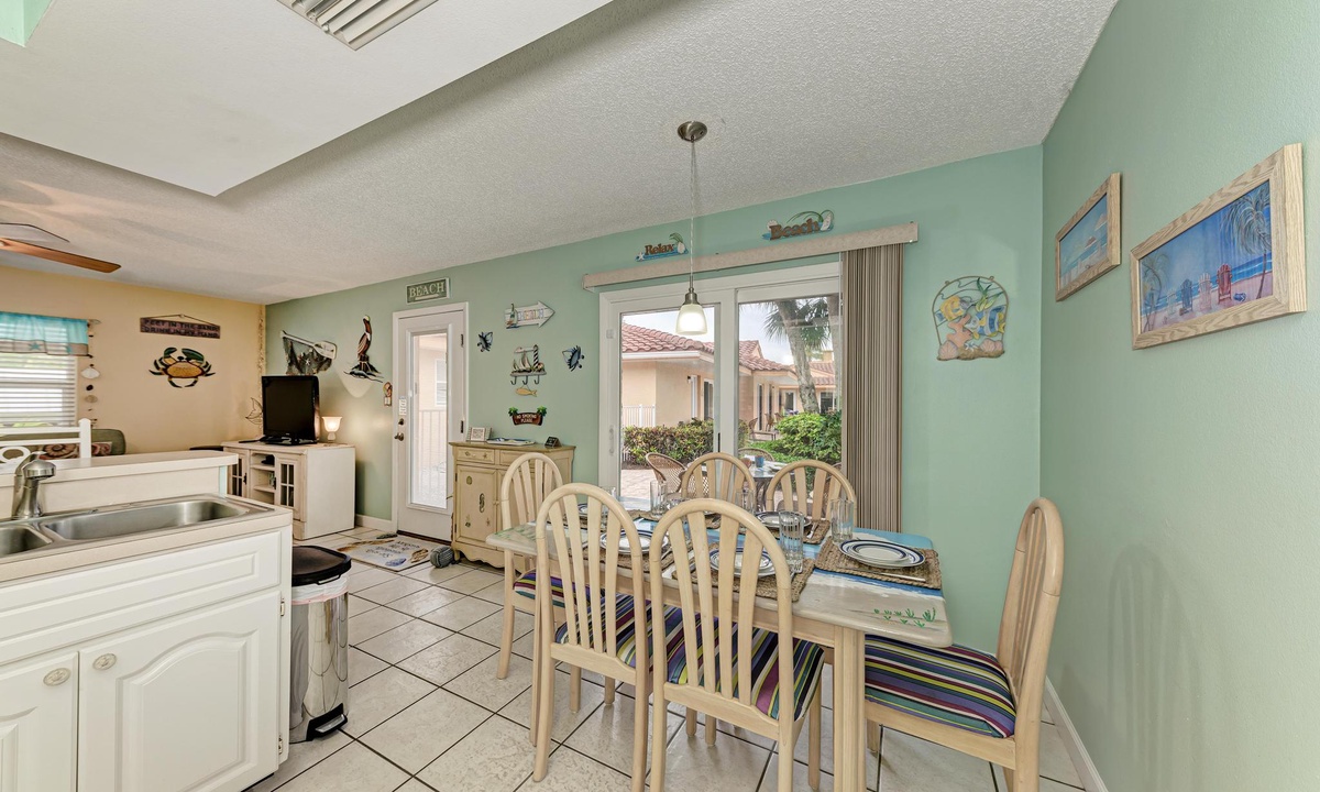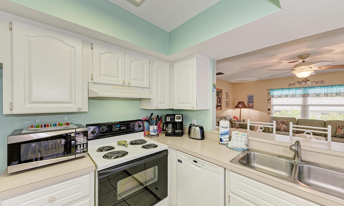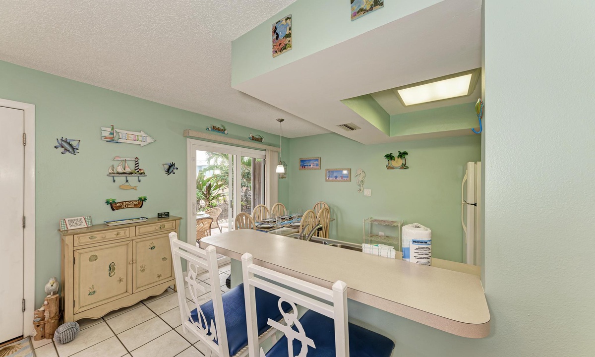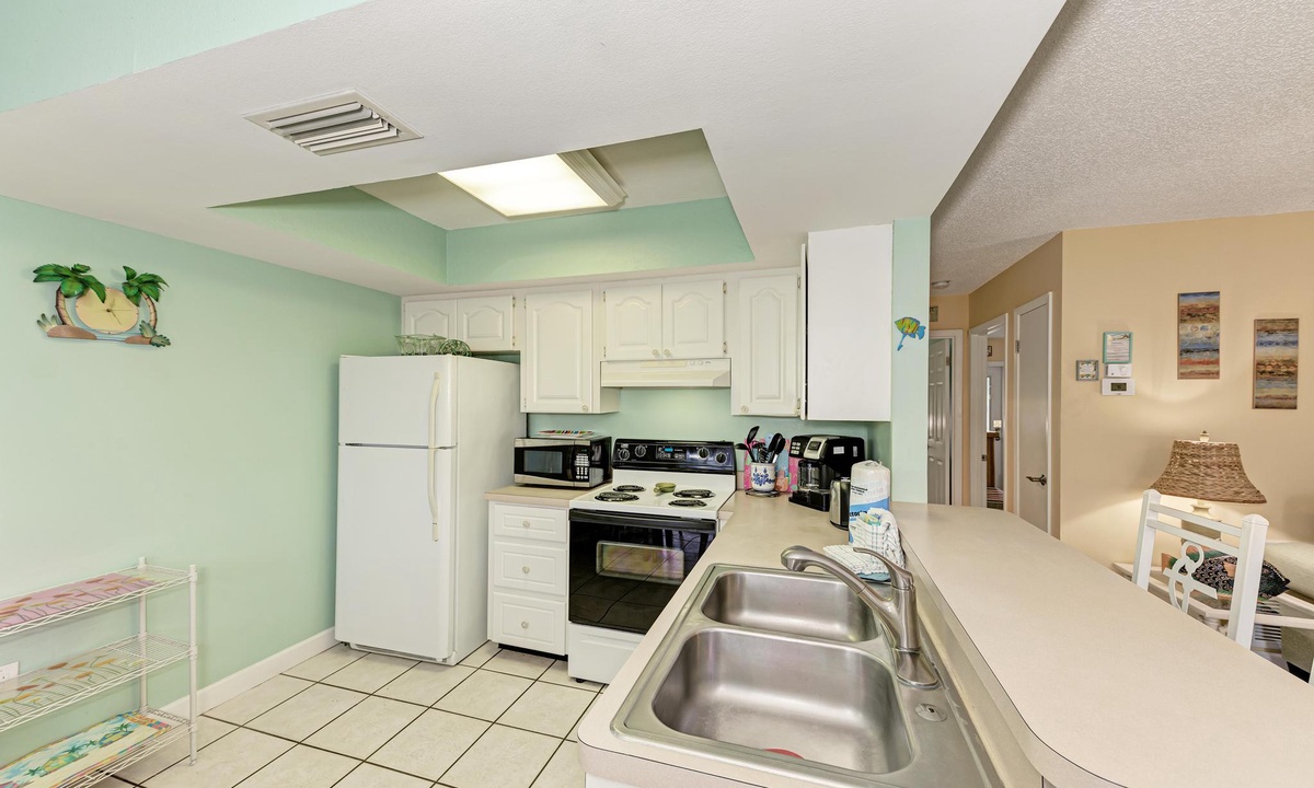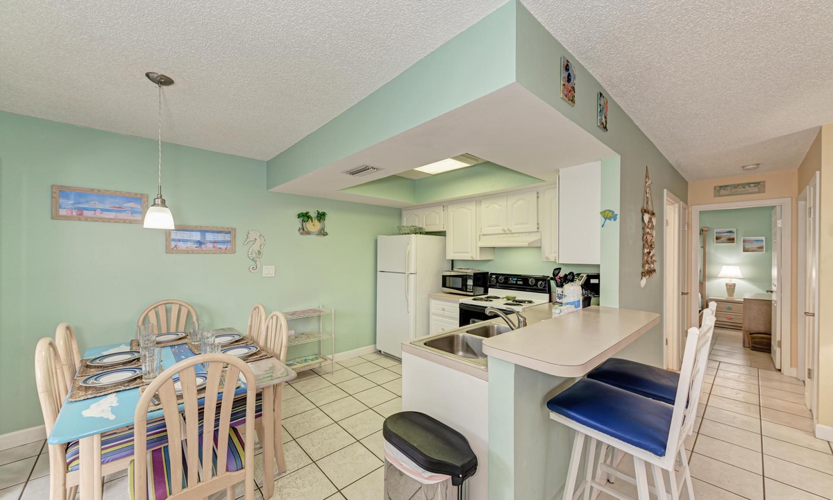 “The Villas 3B” has a well stocked kitchen with all the basics of home including a dishwasher. There is even dining space to accommodate all six guests when dining in your rental.