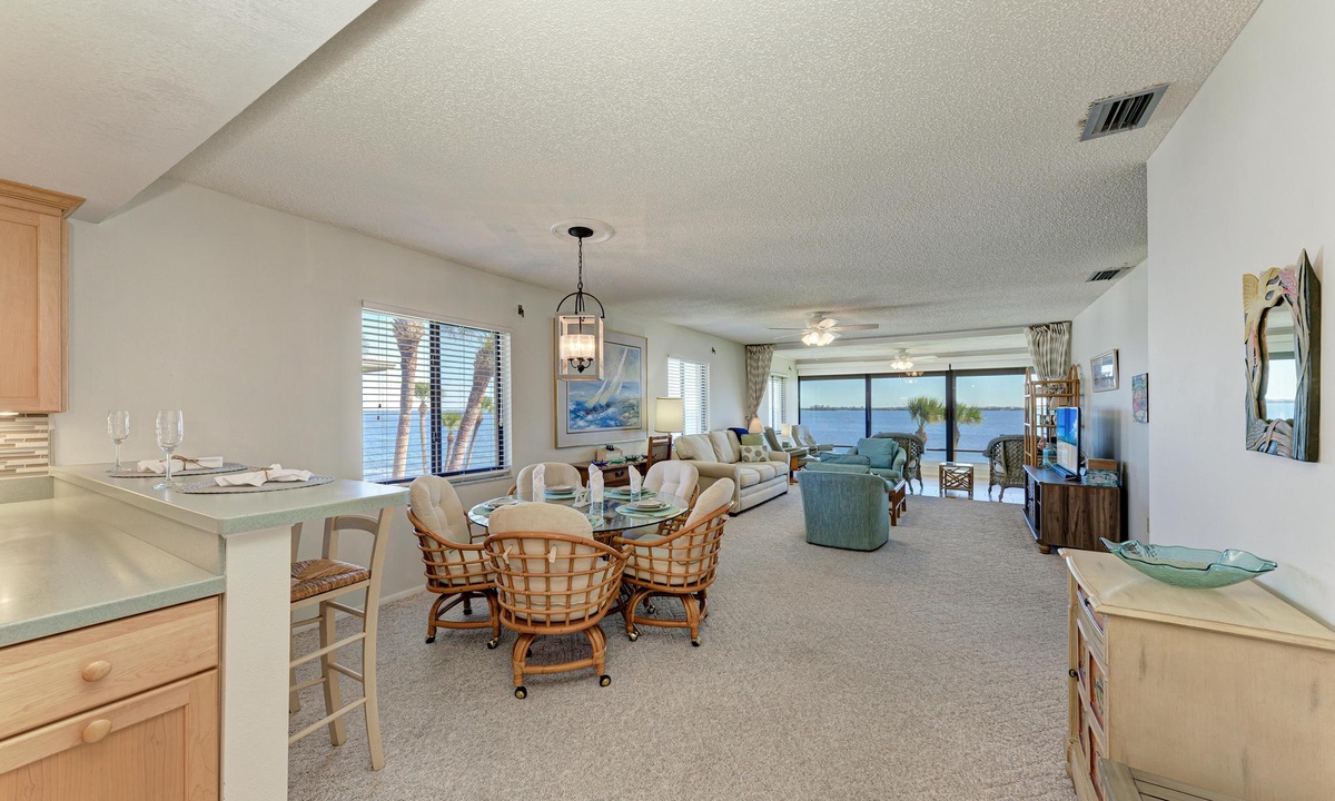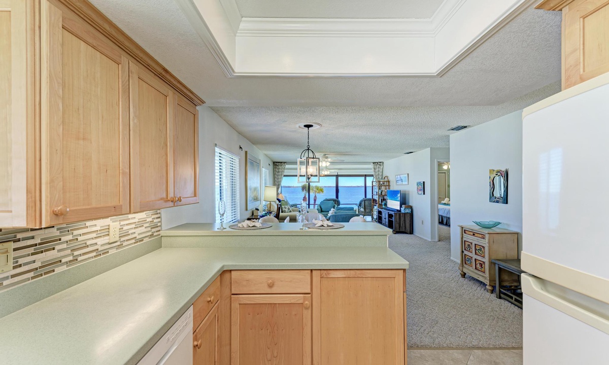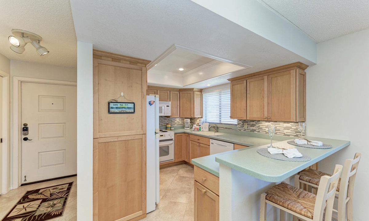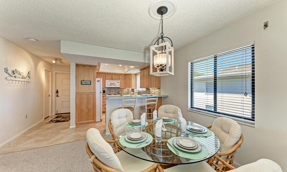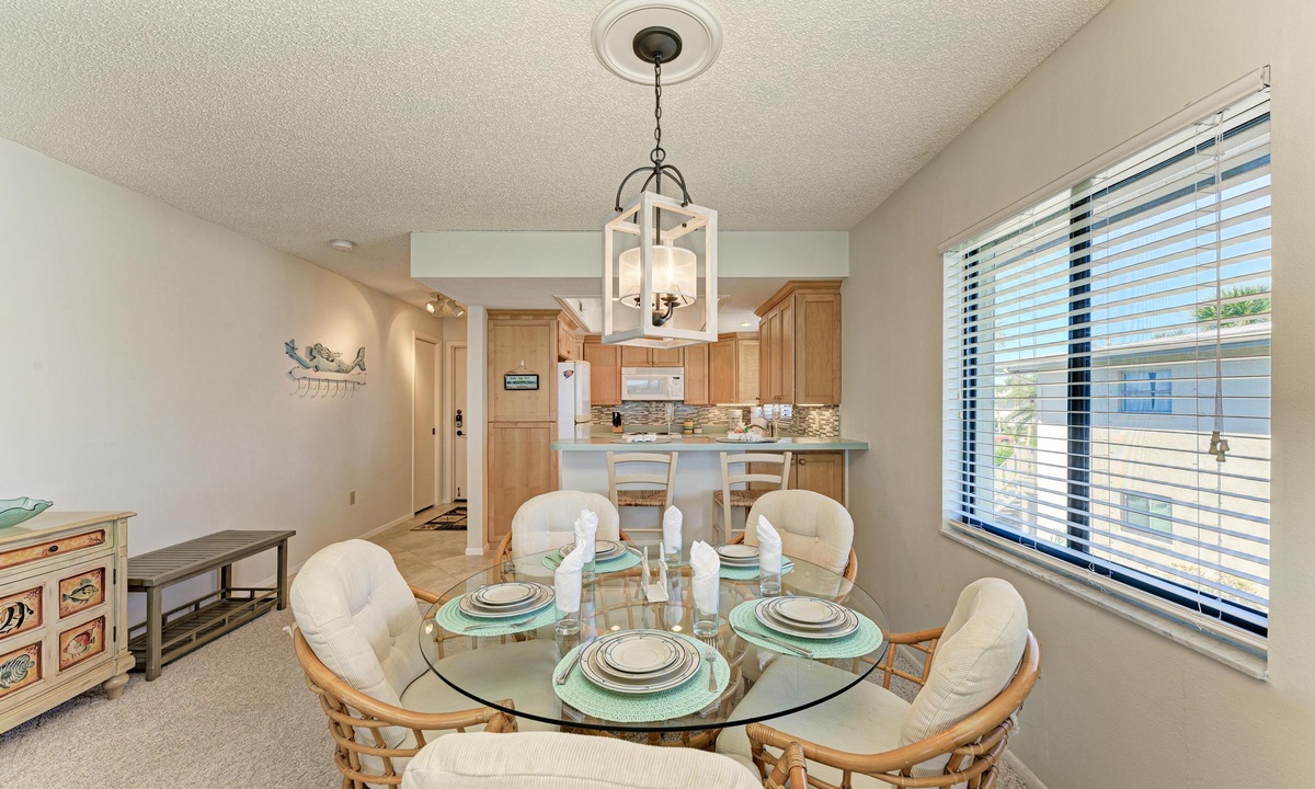 The well-appointed kitchen is equipped with all the essentials for the home cook, including a dishwasher, basic utensils, plates, blender, coffee maker, and ample counter space. The breakfast bar comfortably seats two and is conveniently located between the kitchen and a dining room table with seating for up to six.