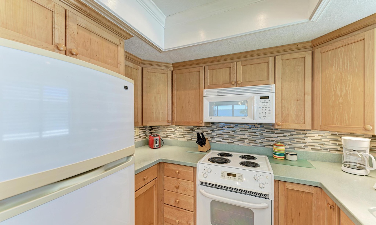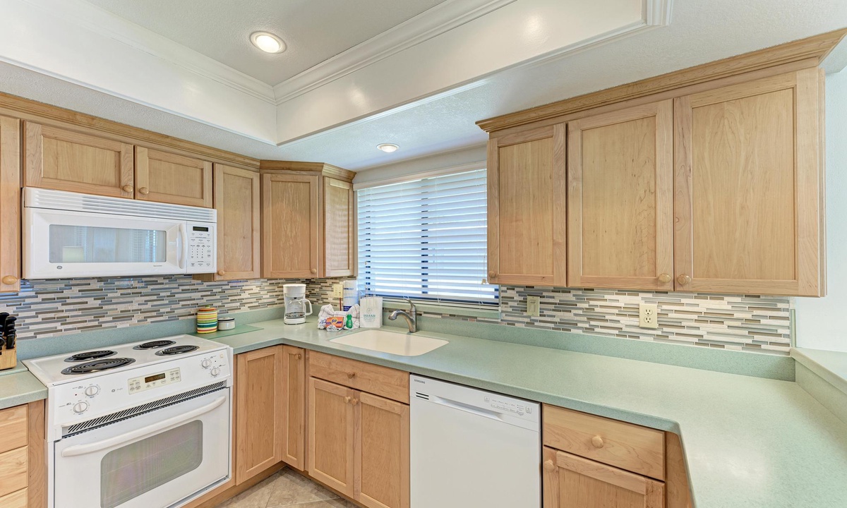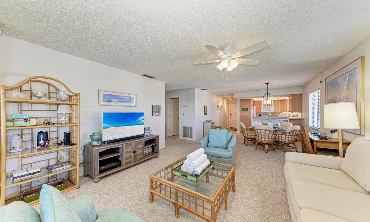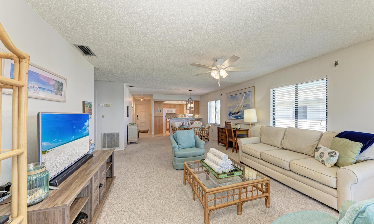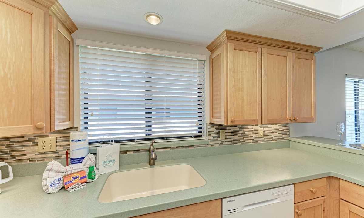 The well-appointed kitchen is equipped with all the essentials for the home cook, including a dishwasher, basic utensils, plates, blender, coffee maker, and ample counter space. The breakfast bar comfortably seats two and is conveniently located between the kitchen and a dining room table with seating for up to six.