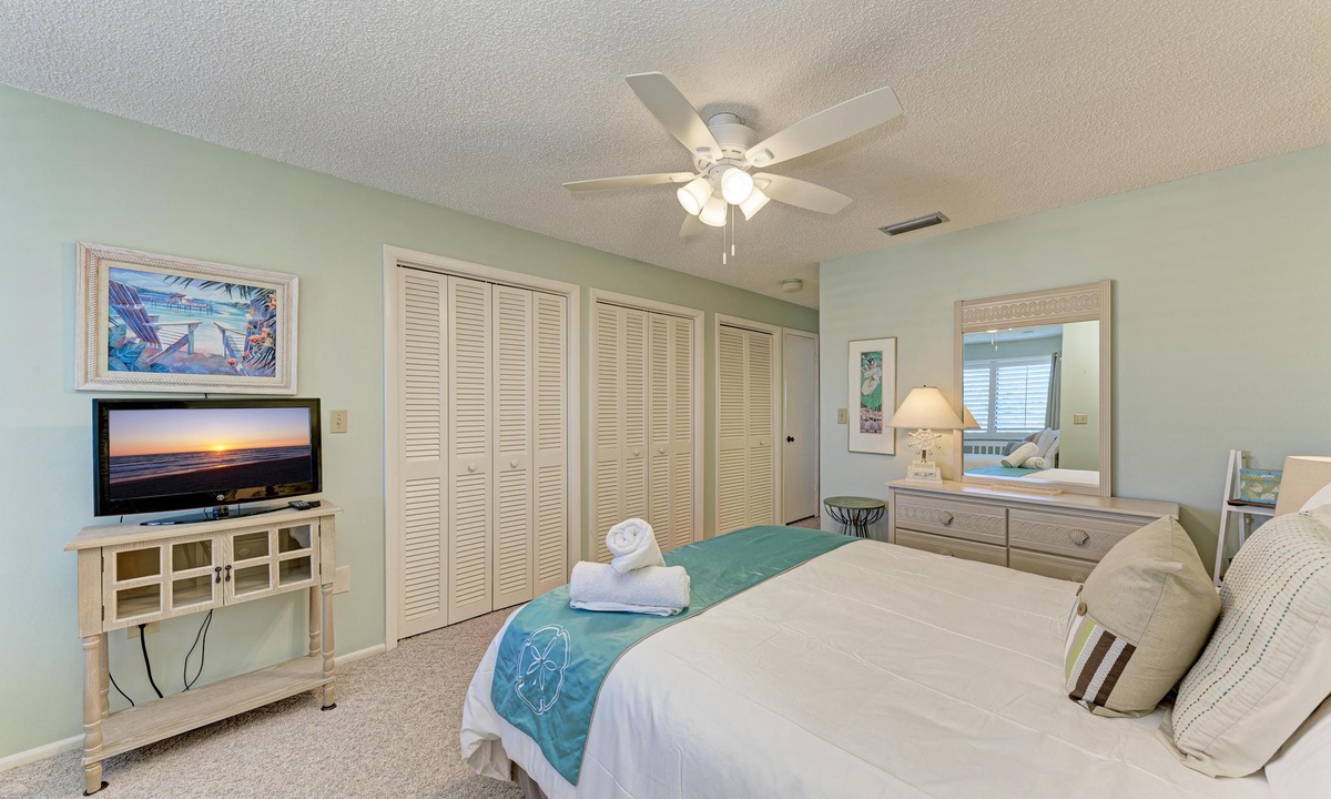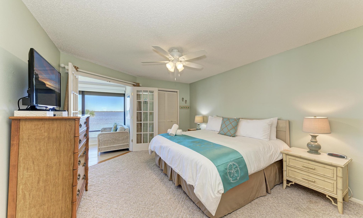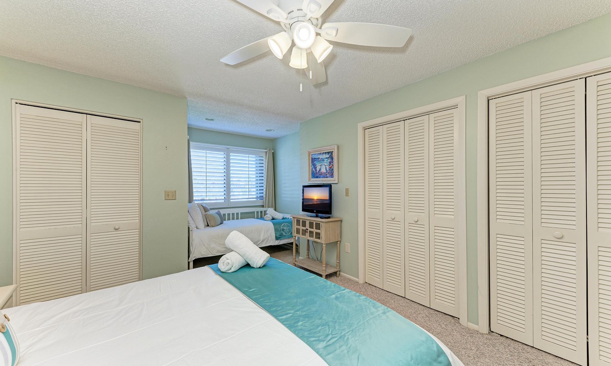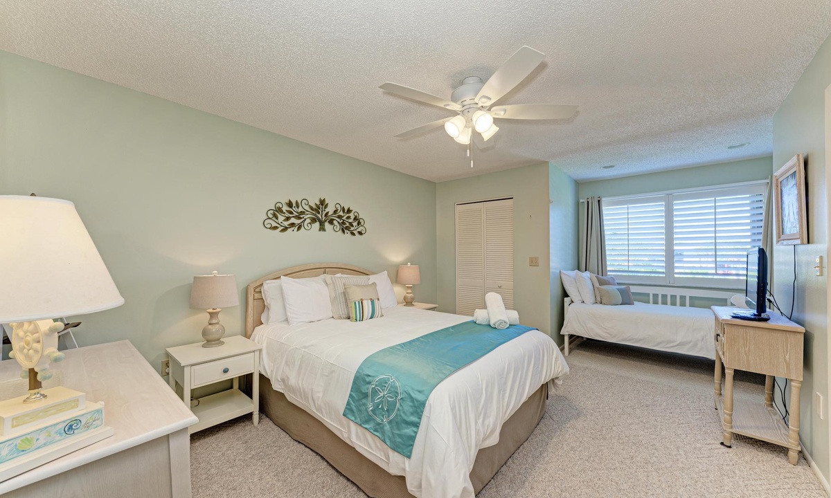 Inside "West Bay Point 88," you'll discover a tasteful Florida chic decor in a luxuriously comfortable setting. The Master bedroom with a King bed is adorned with premium linens and offers access to the enclosed lanai. The guest bedroom features a Queen bed and a Twin bed, also dressed in premium linens, along with a television for your entertainment.