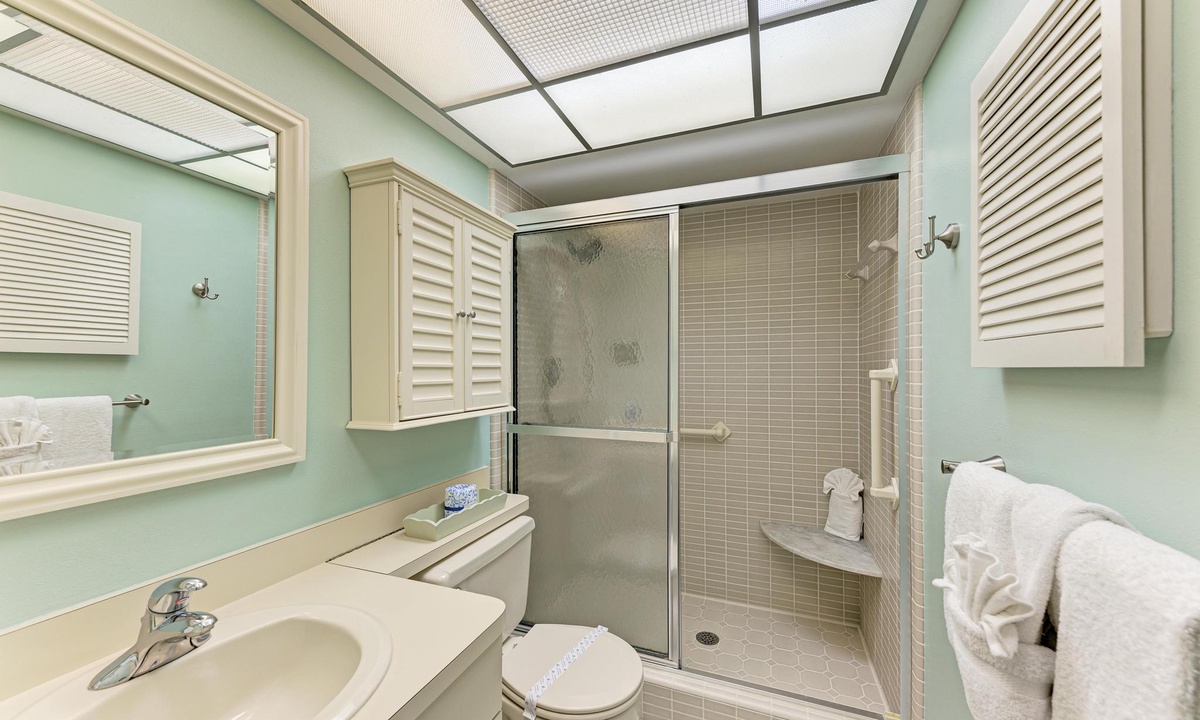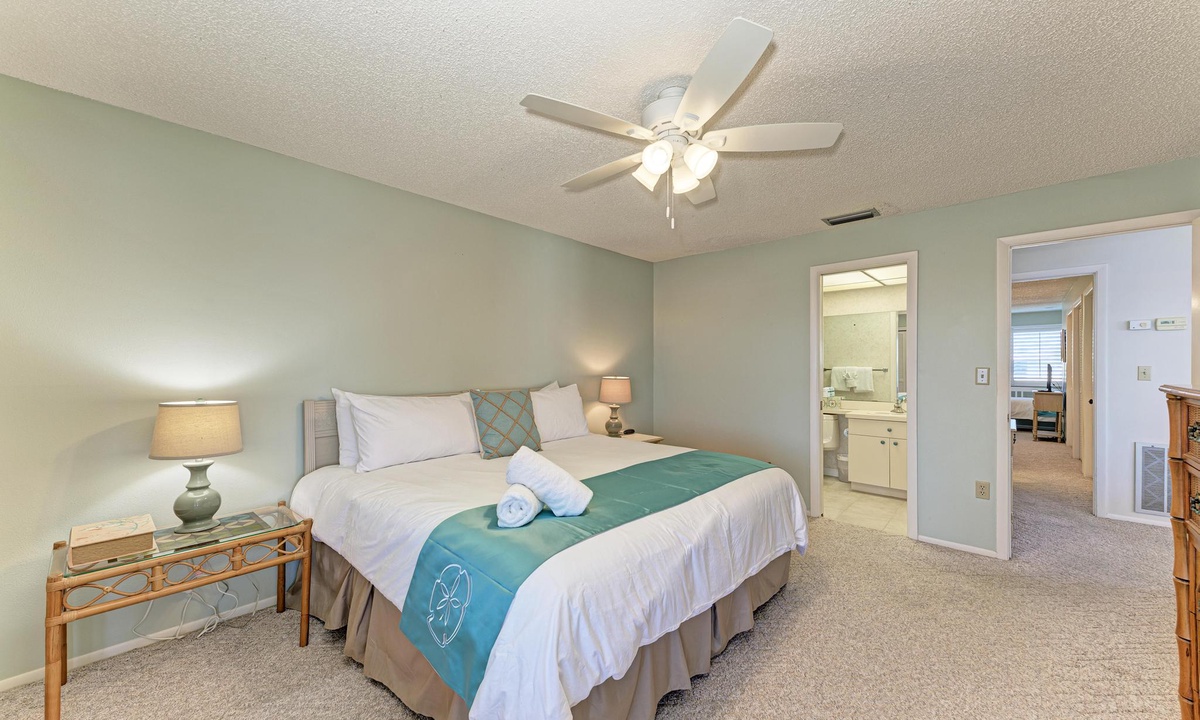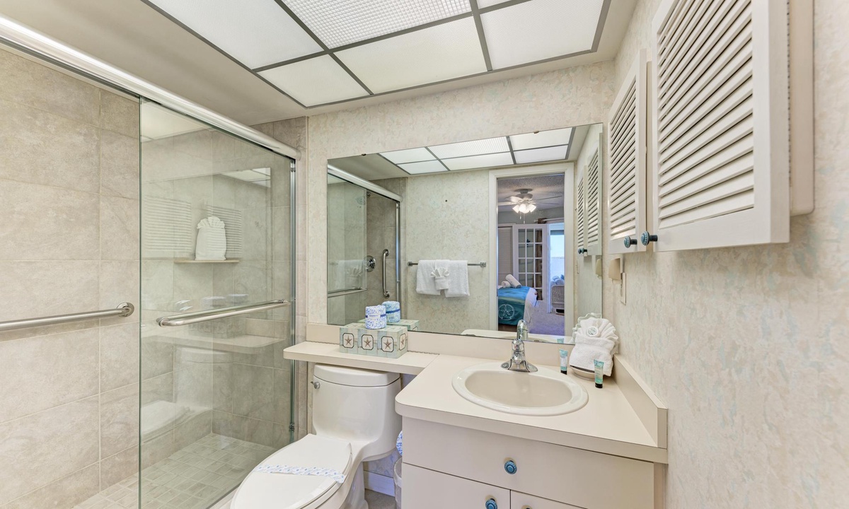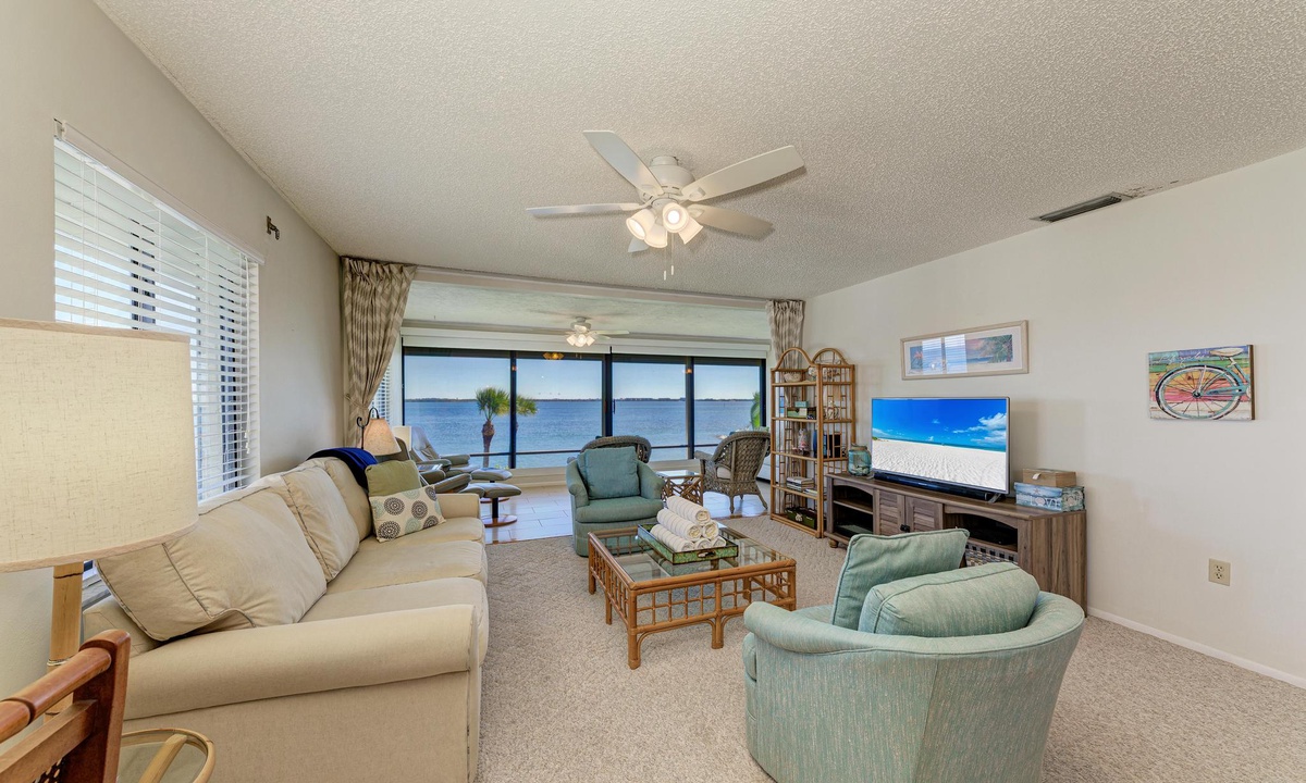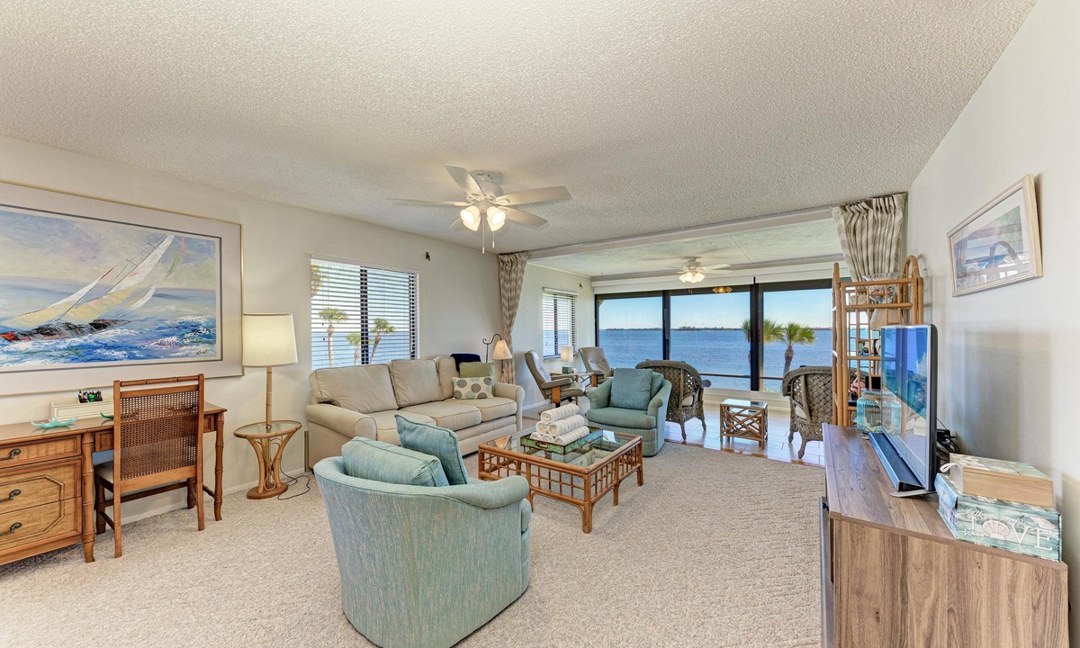 Inside "West Bay Point 88," you'll discover a tasteful Florida chic decor in a luxuriously comfortable setting. The Master bedroom with a King bed is adorned with premium linens and offers access to the enclosed lanai. The guest bedroom features a Queen bed and a Twin bed, also dressed in premium linens, along with a television for your entertainment.